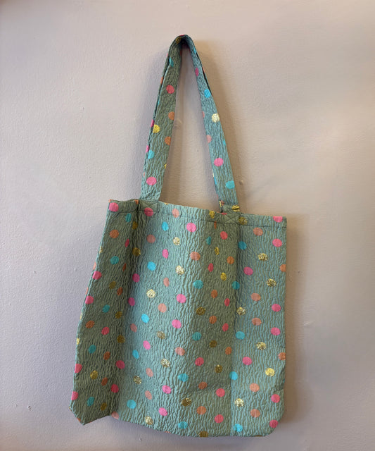 Skuldertaske i brokade resttekstil - oliven grøn med prikker