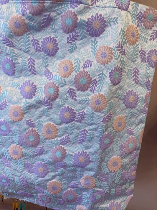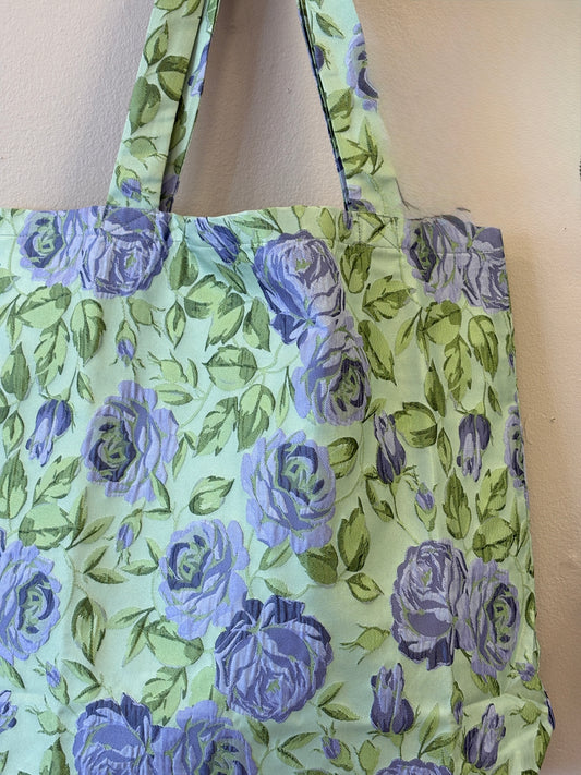 Skuldertaske i brokade resttekstil - lysegrøn med lilla blomster
