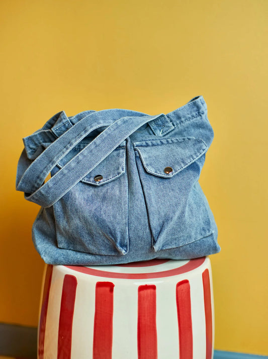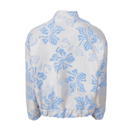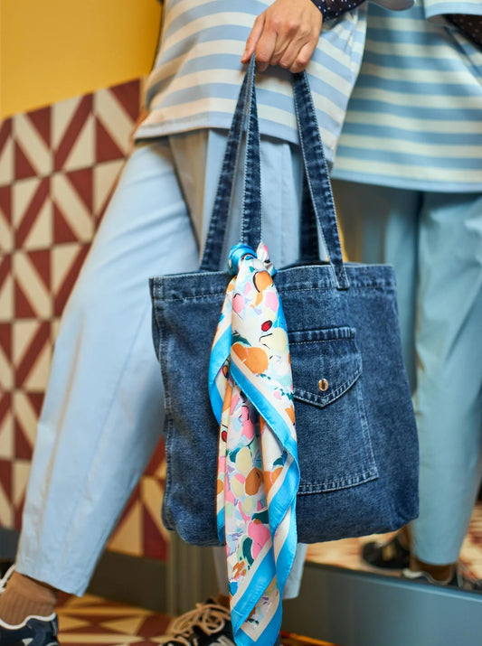Skuldertaske i brokade resttekstil - lyseblå med mønster i blå og guld