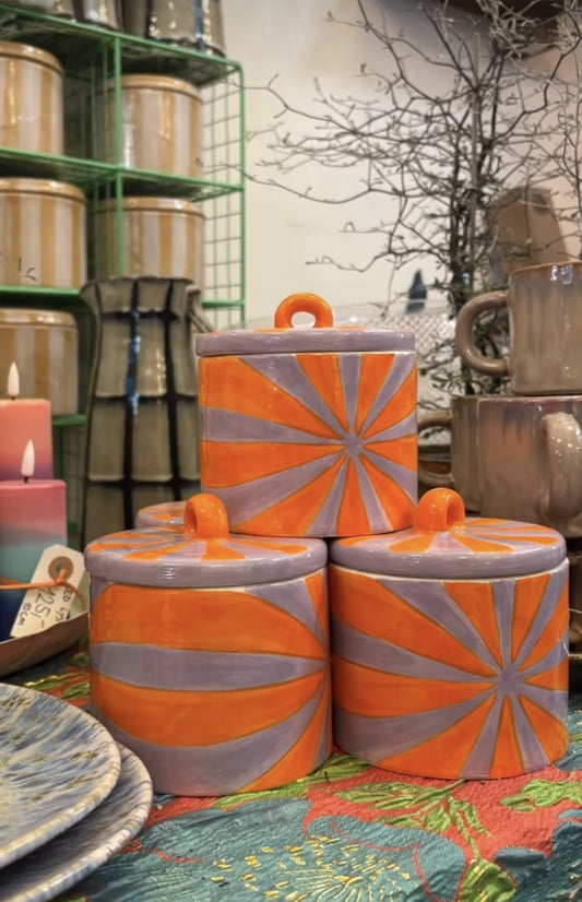 Bolchestribet keramik krukke orange / lilla mindst
