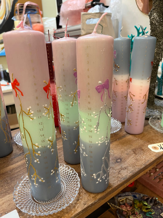 Kalenderlys i sart rosa, mint grøn og grågrøn