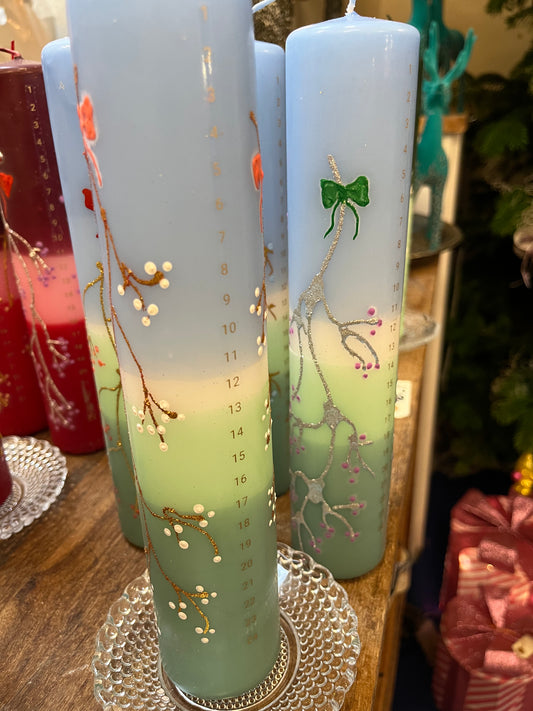 Kalenderlys støvet grøn, mintgrøn, hvid og lysblå