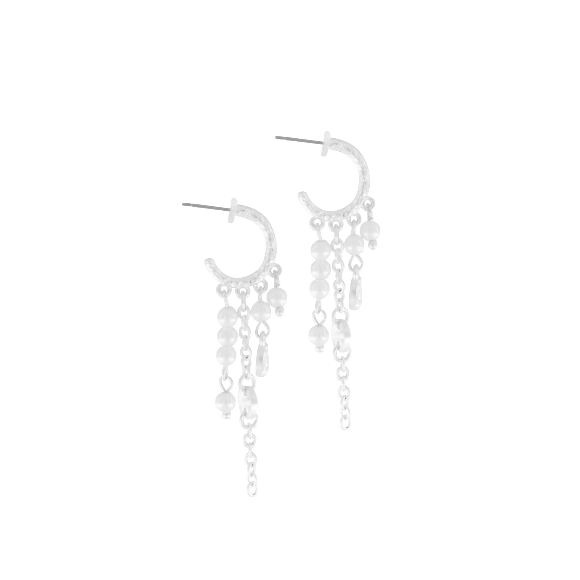 Elegante åbne hoops, med kæder og hvide perler. Øreringene har en hamrede og rå overflade, hvilket skaber en lækker kontrast til det pæne design. De passer perfekt til hverdagen, hvis du gerne vil sætte prikken over i ét på hverdagstøjet.