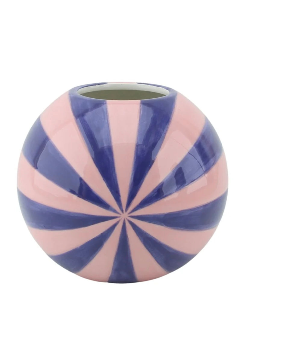 Skøn bolchestribet keramik vase i blå / lyserød farve. Smuk og dekorativ både med og uden blomster.