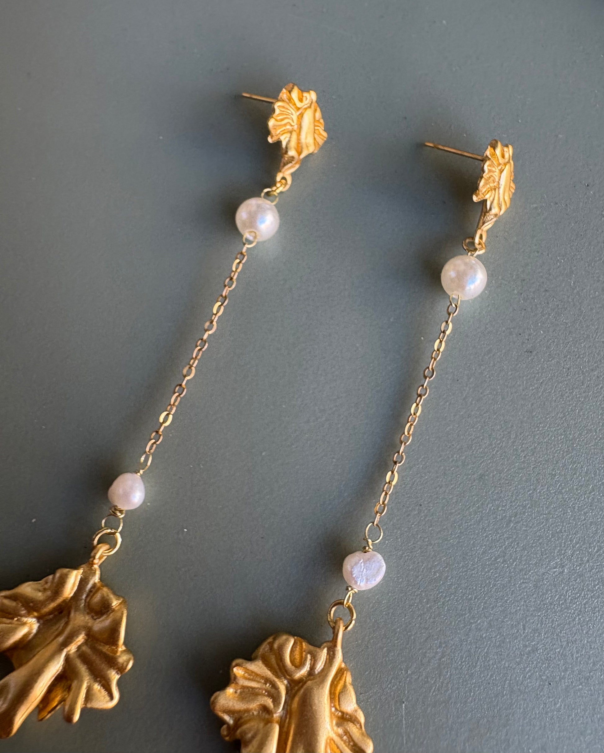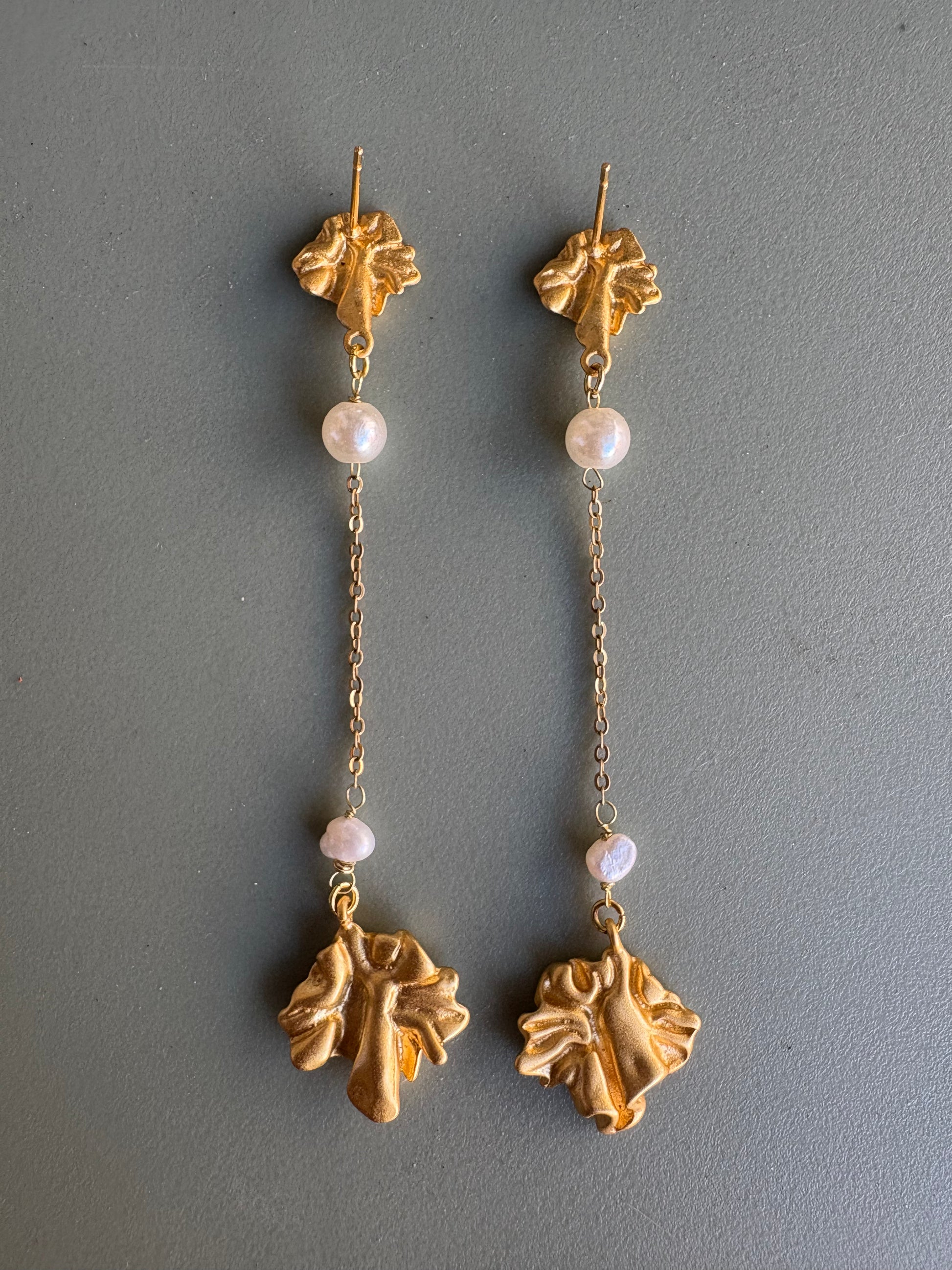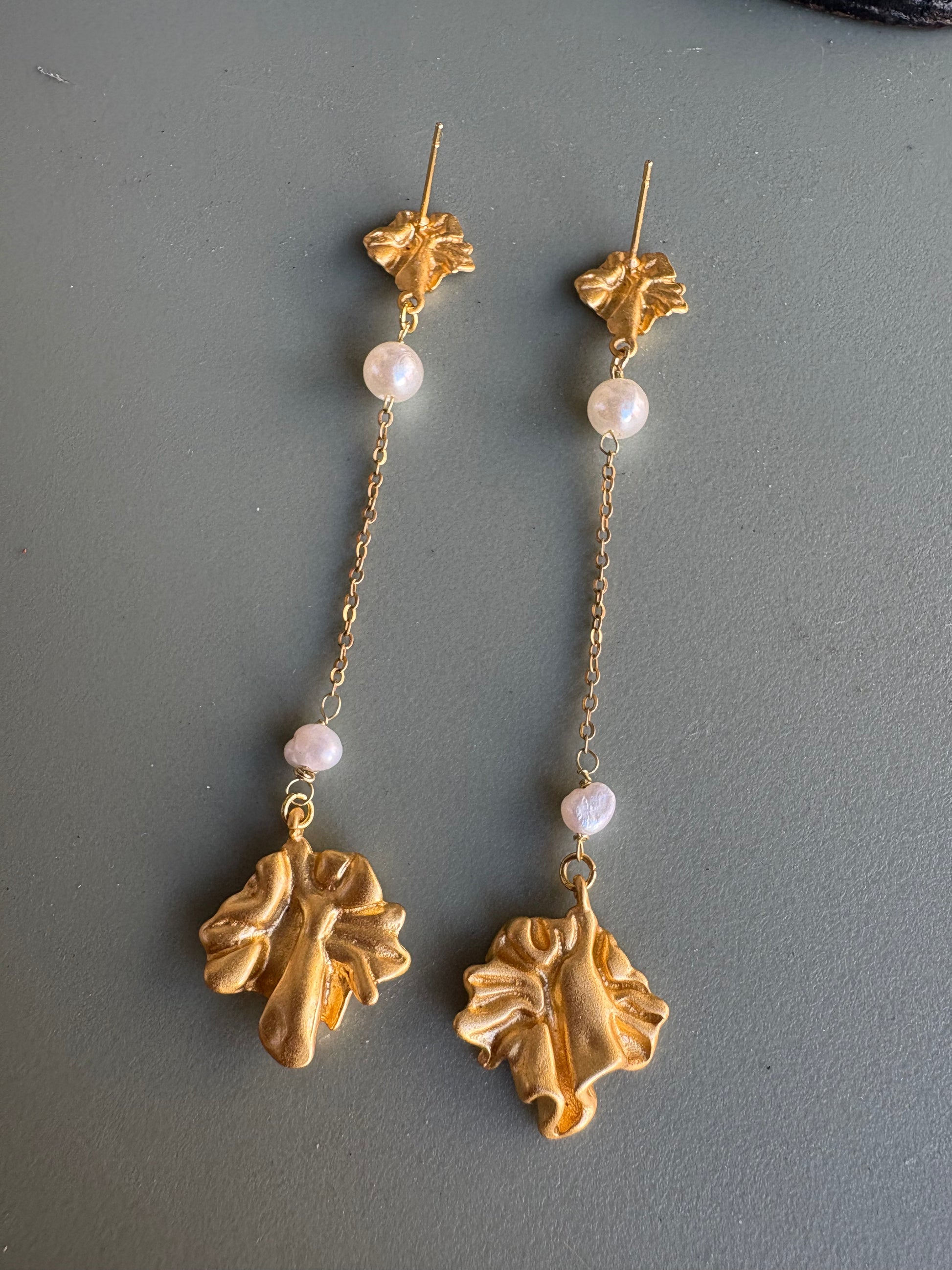 Elegante øreringe med perle, ferskvandsperler og blad vedhæng.