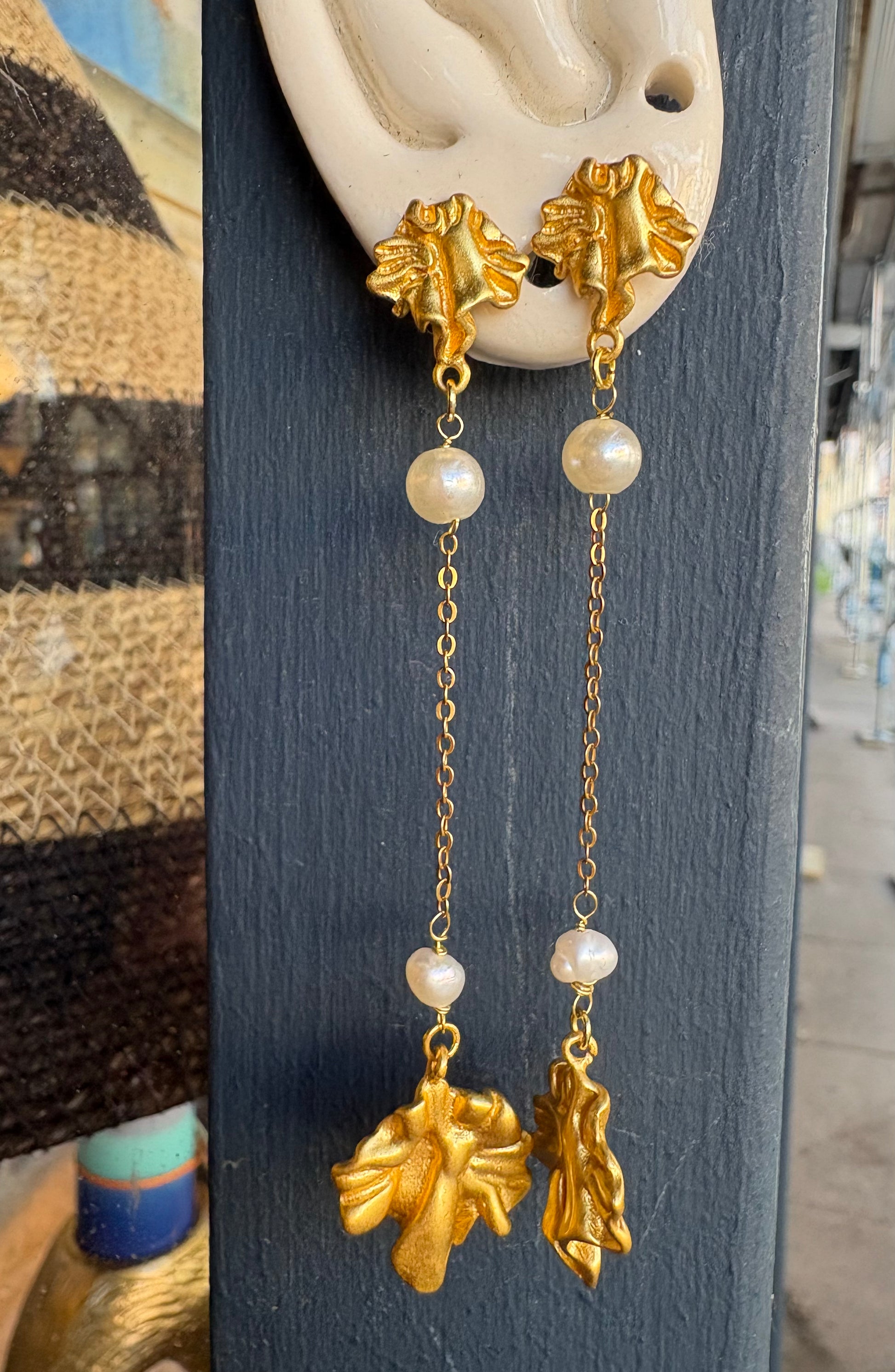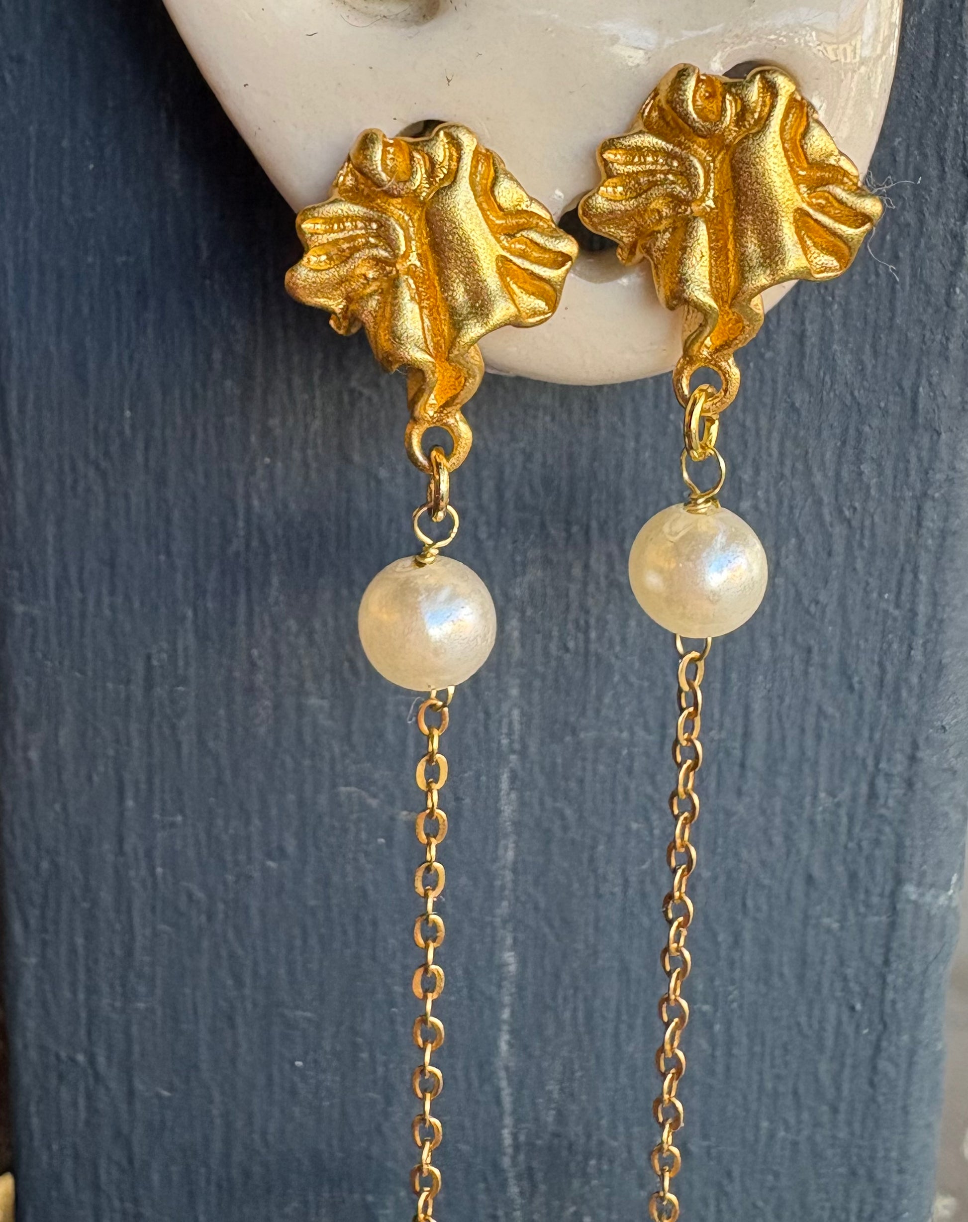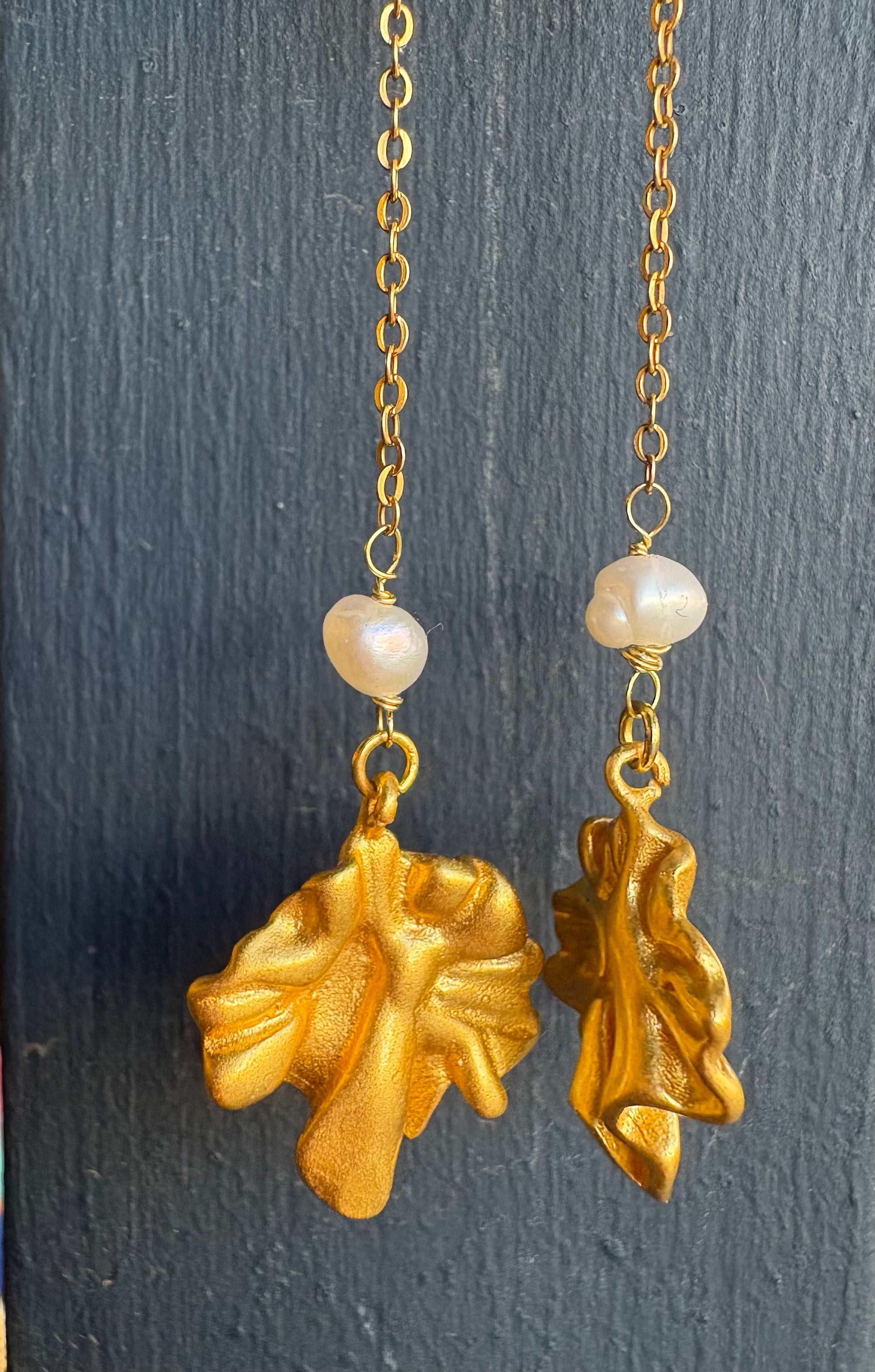 Elegante øreringe med perle, ferskvandsperler og blad vedhæng.