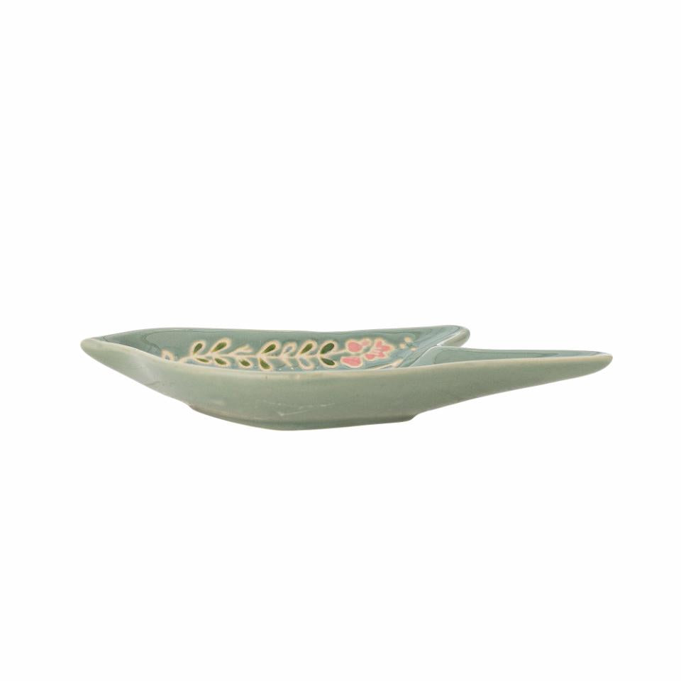 Denne charmerende skål formet som en fugl er et smukt møde mellem funktion og kunst. Den bløde grønne nuance med håndmalede blomsterdetaljer i rosa, rød og hvid gør hver skål til et unikt kunstværk.