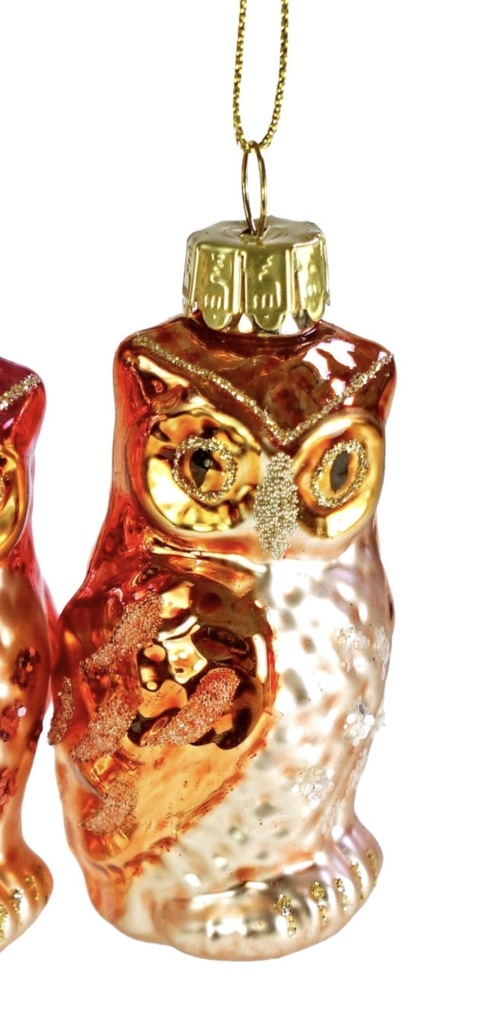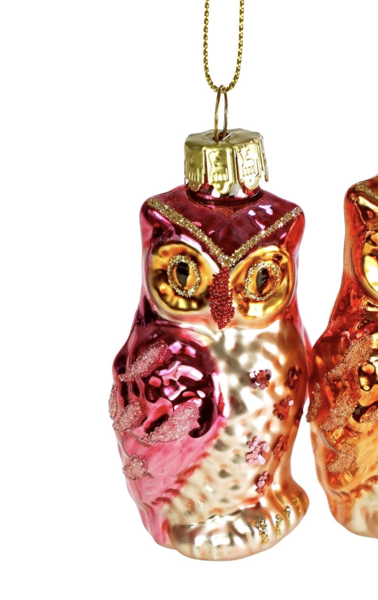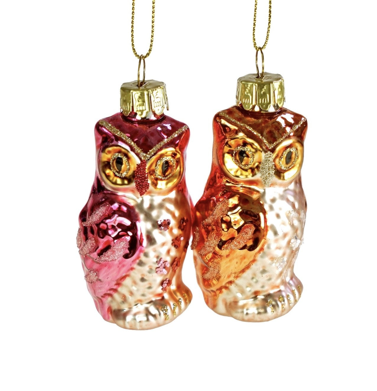 Skønne ugler i glas til juletræet. Findes i 2 farve, lyserød og orange.