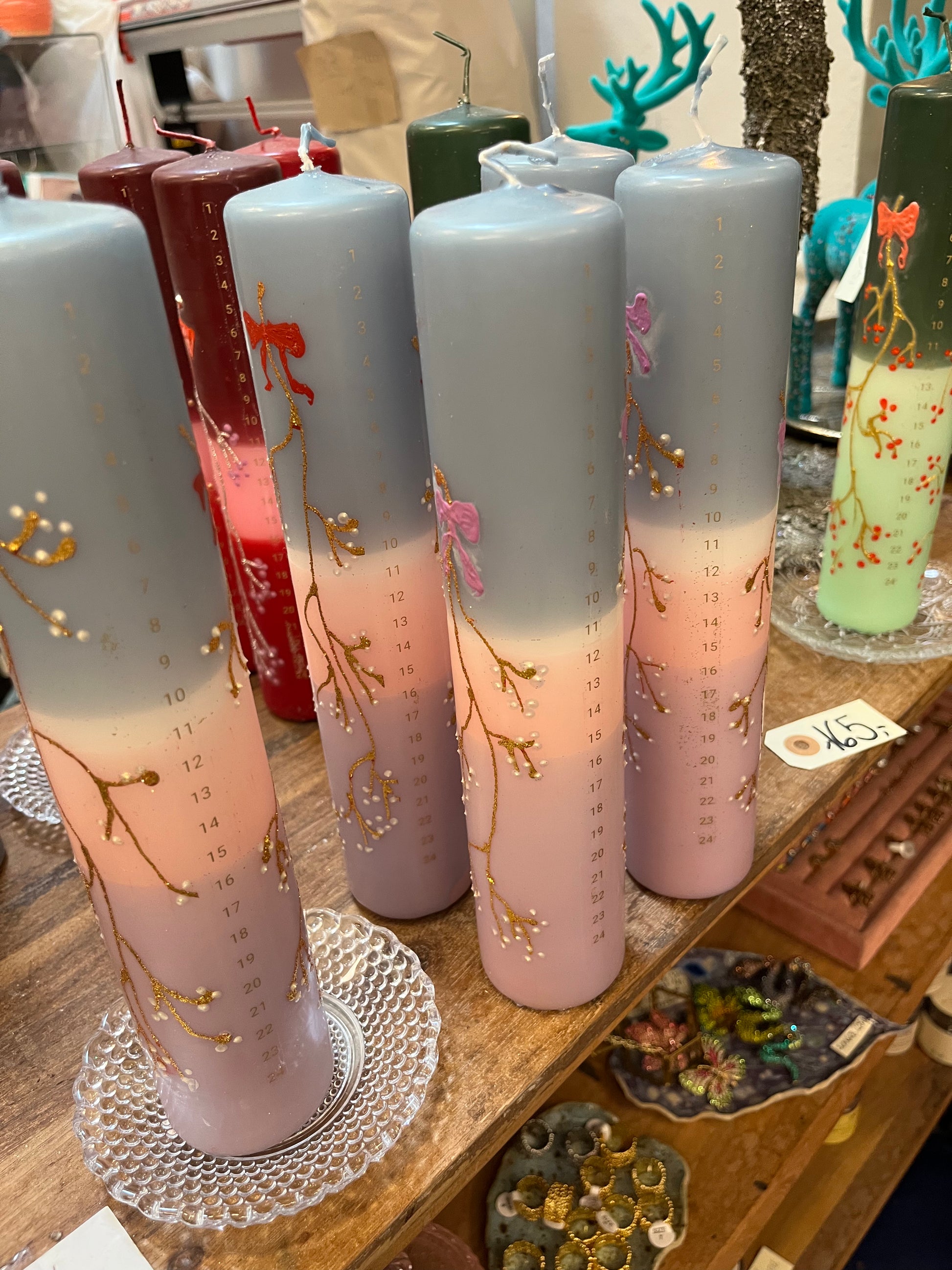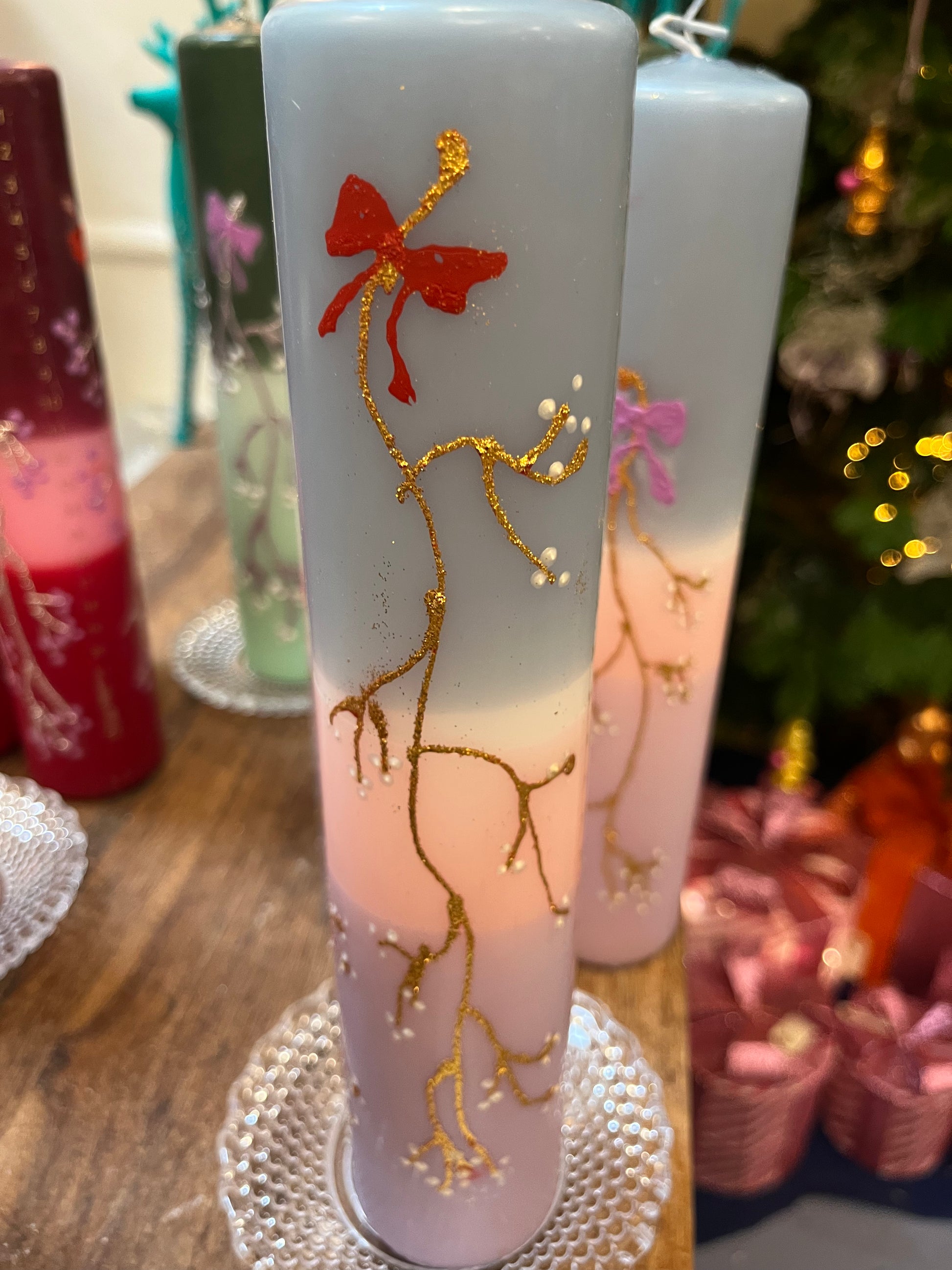 Stine laver hvert år et nyt design og i år 2025, er det glimmer, mistelten og sløjfer der sætter prikken over iét på årets kalenderlys.