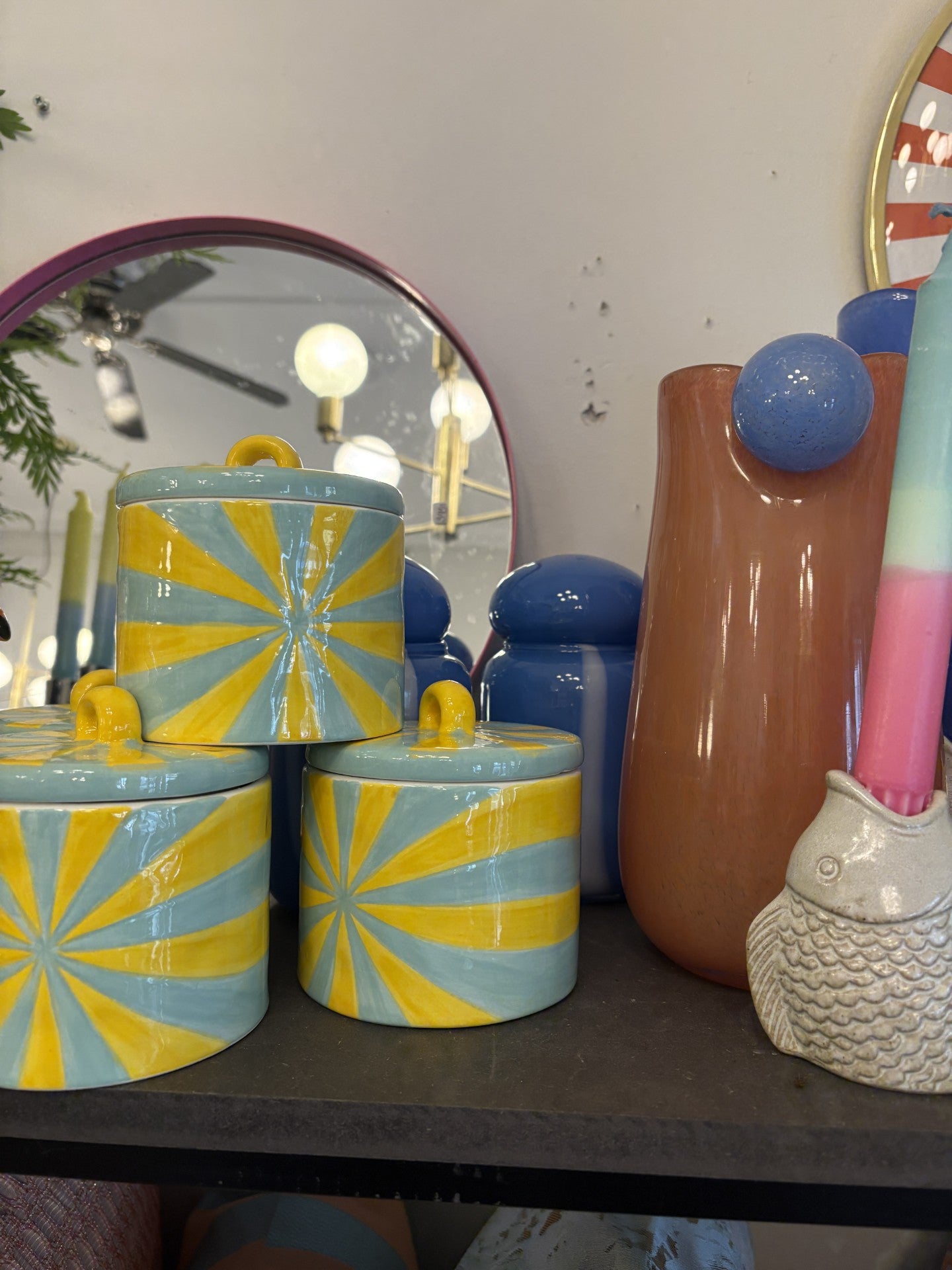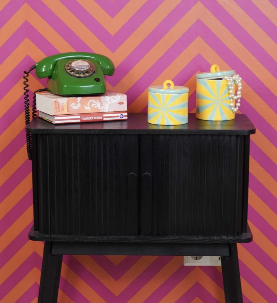 Den her keramik krukke er simpelthen så skøn. Med et mønster der i den grad minder om bolcher, er krukken perfekt til slik. Men den er også en humoristisk og farverig detalje til f.eks. smykker, nøgler og andre små ting.