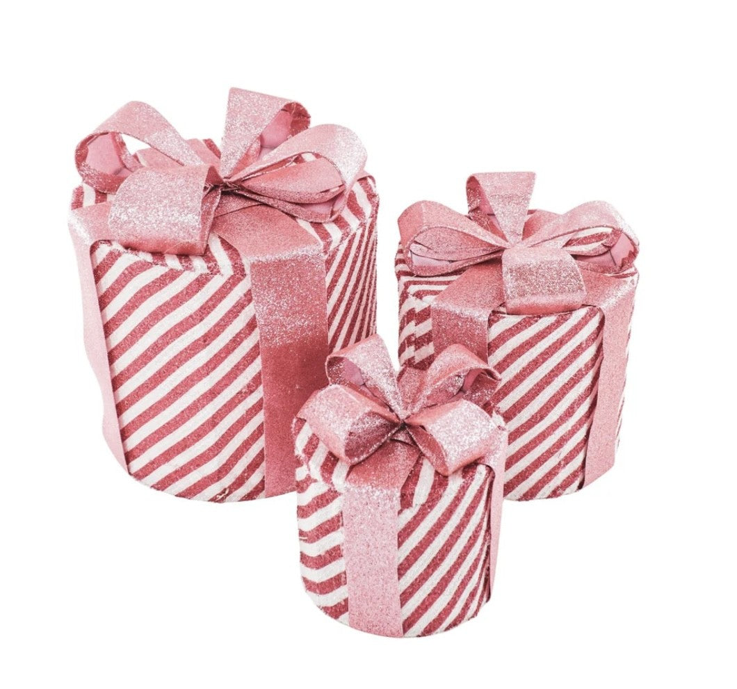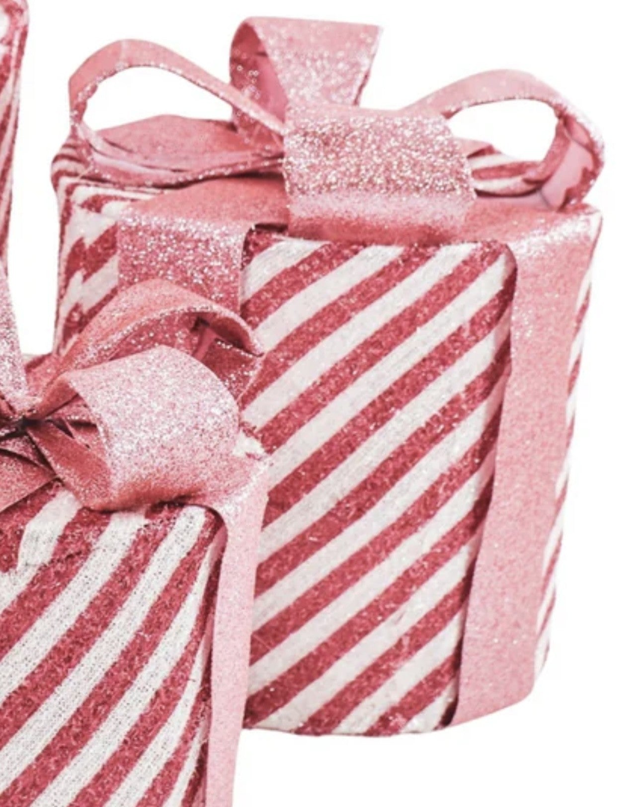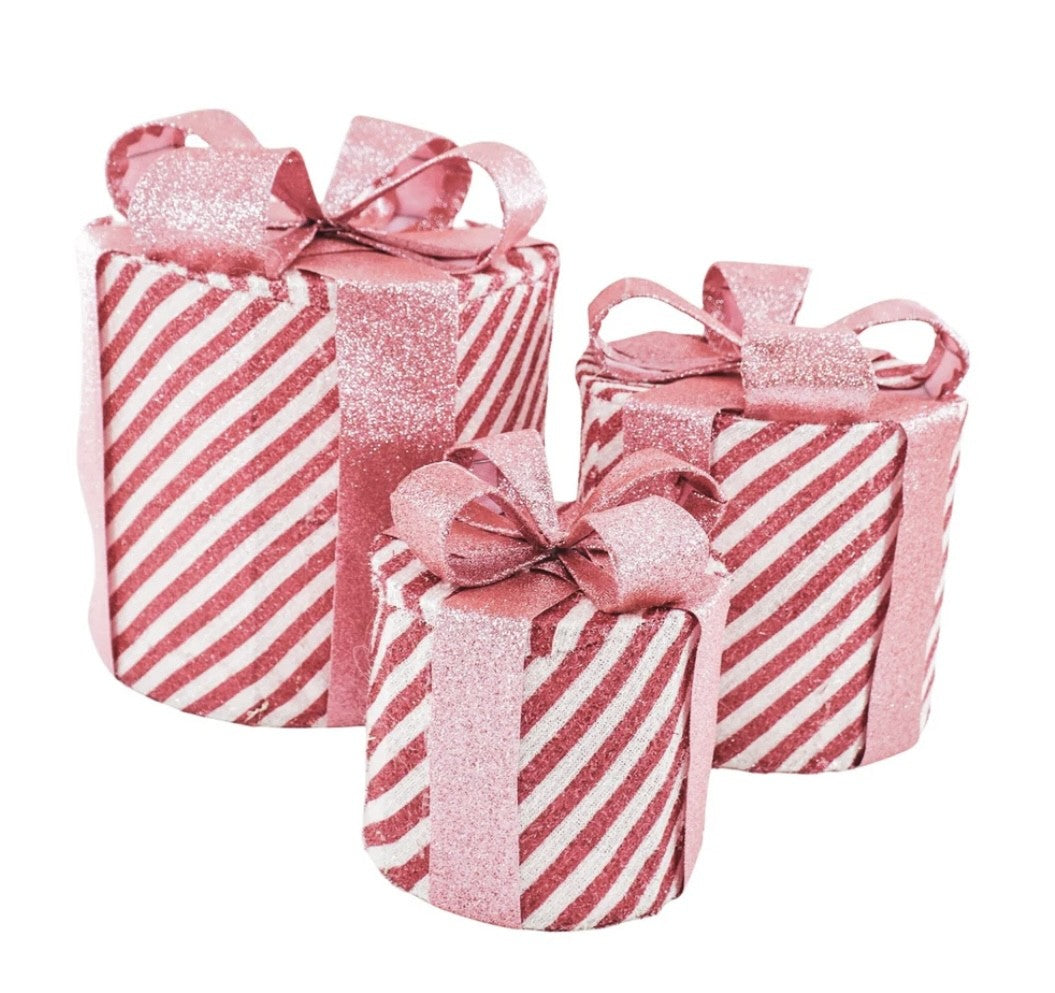 Her er de skønneste runde LED gaver, med sløjfe og pink og hvide bolchestriber. Gaverne er hule indeni hvor du finder led lysene. Lyset giver et behageligt varmt lys. Gaverne er dekoration alene, eller du kan gemme din gave til modtageren indeni. Lad dem pynte under juletræet, eller brug dem som pynt på jule og fødselsdagsbordet.