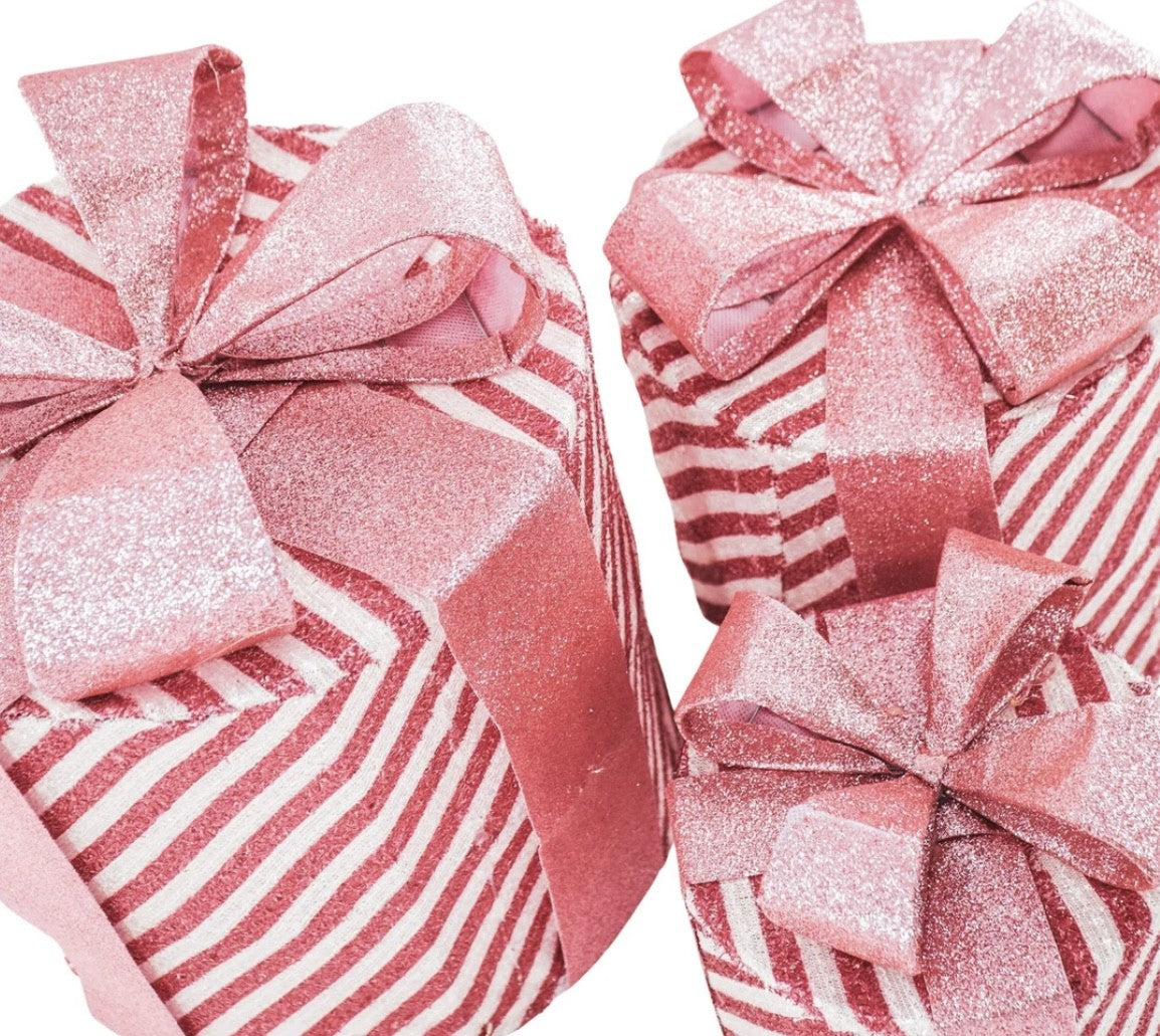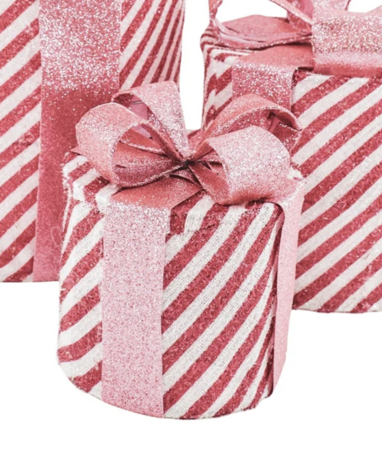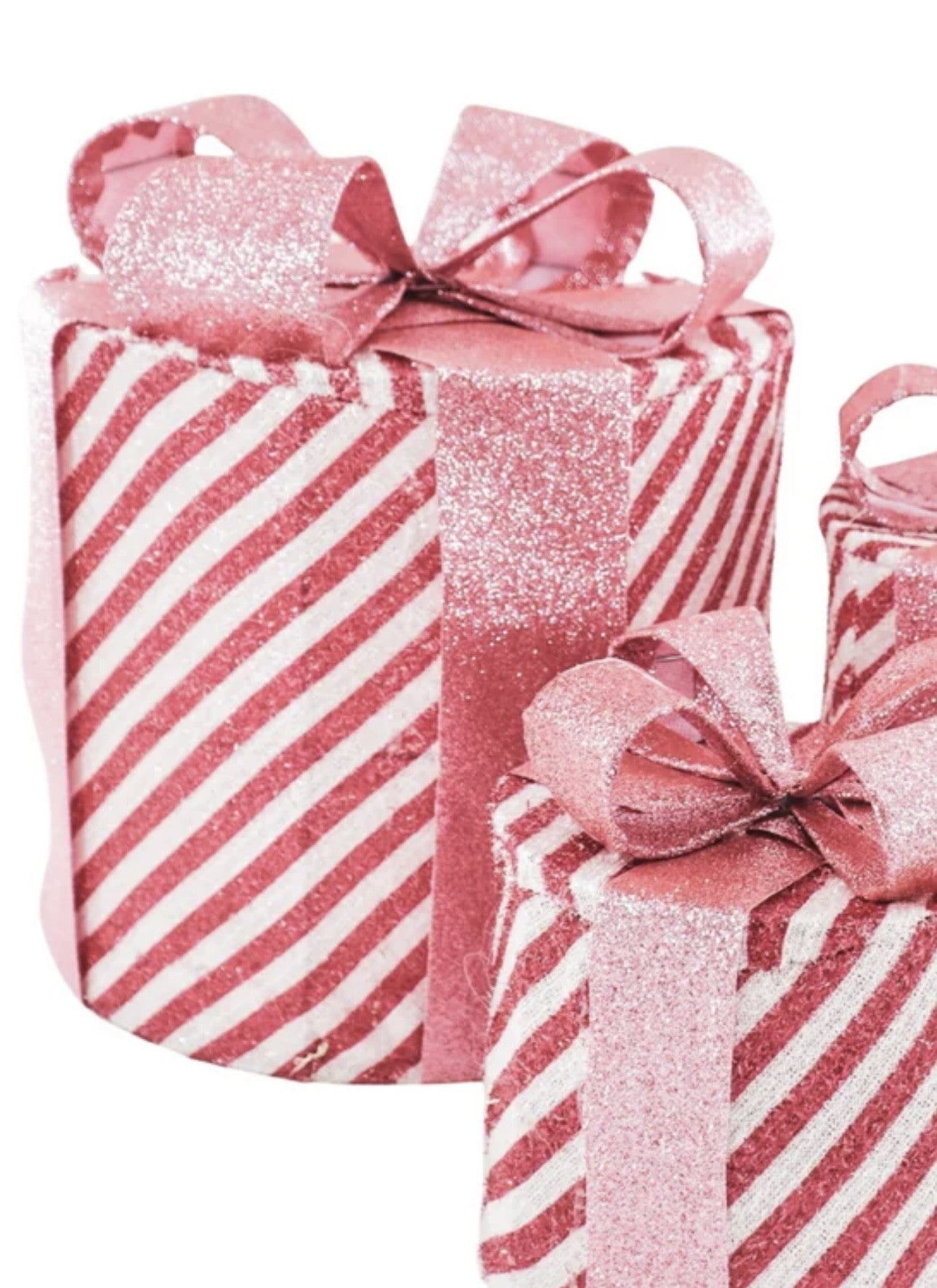 Her er de skønneste runde LED gaver, med sløjfe og pink og hvide bolchestriber. Gaverne er hule indeni hvor du finder led lysene. Lyset giver et behageligt varmt lys. Gaverne er dekoration alene, eller du kan gemme din gave til modtageren indeni. Lad dem pynte under juletræet, eller brug dem som pynt på jule og fødselsdagsbordet.