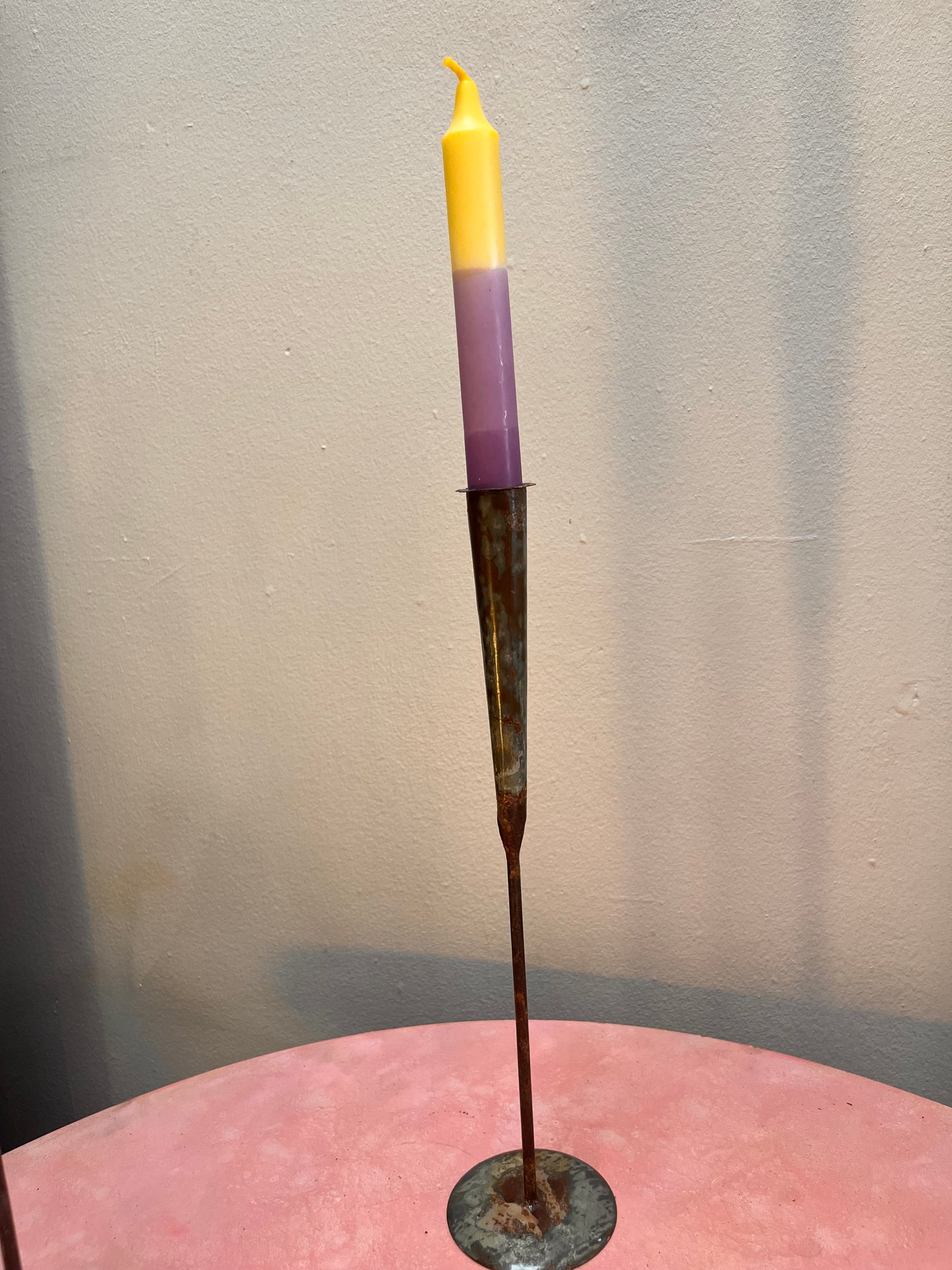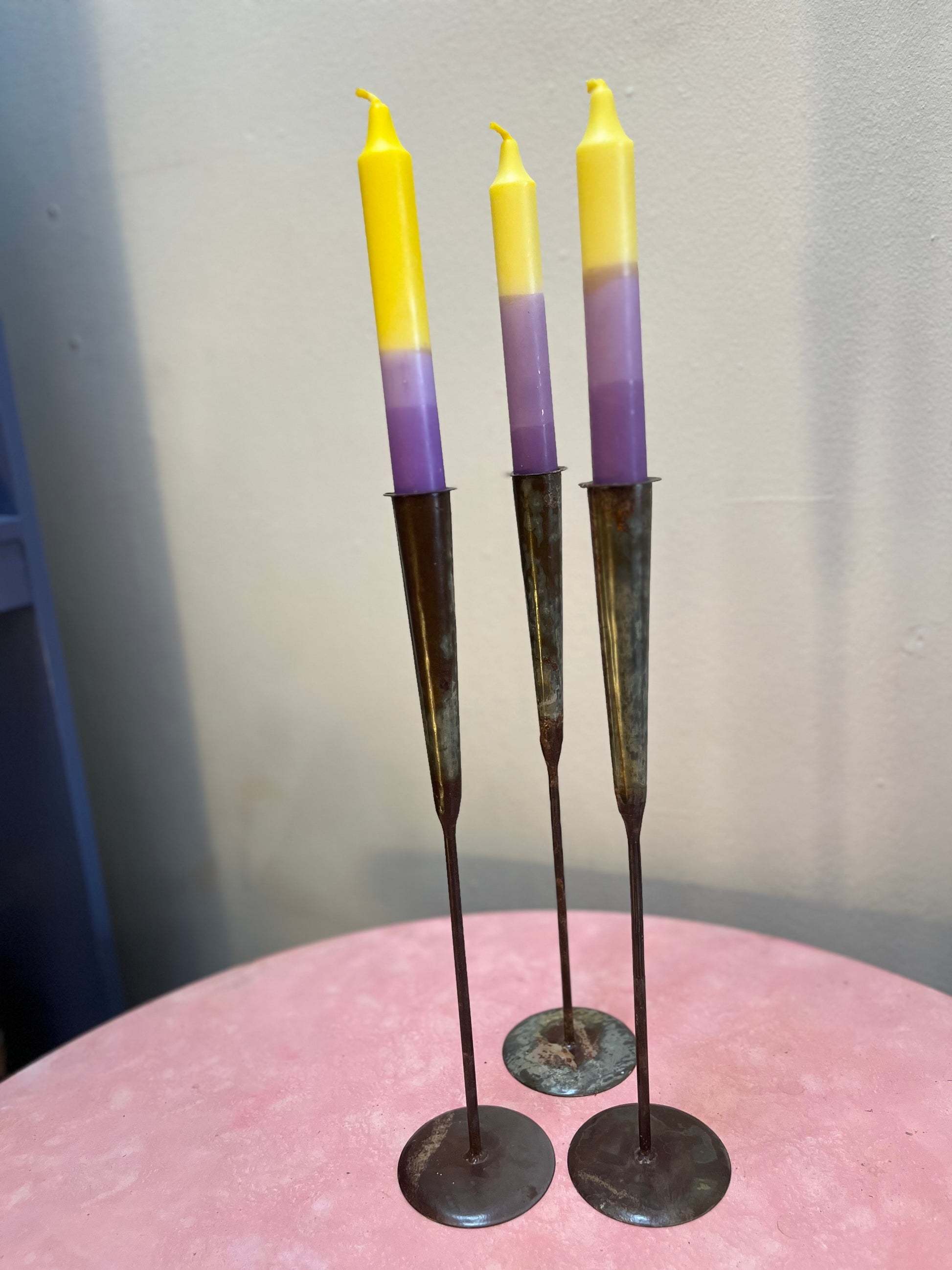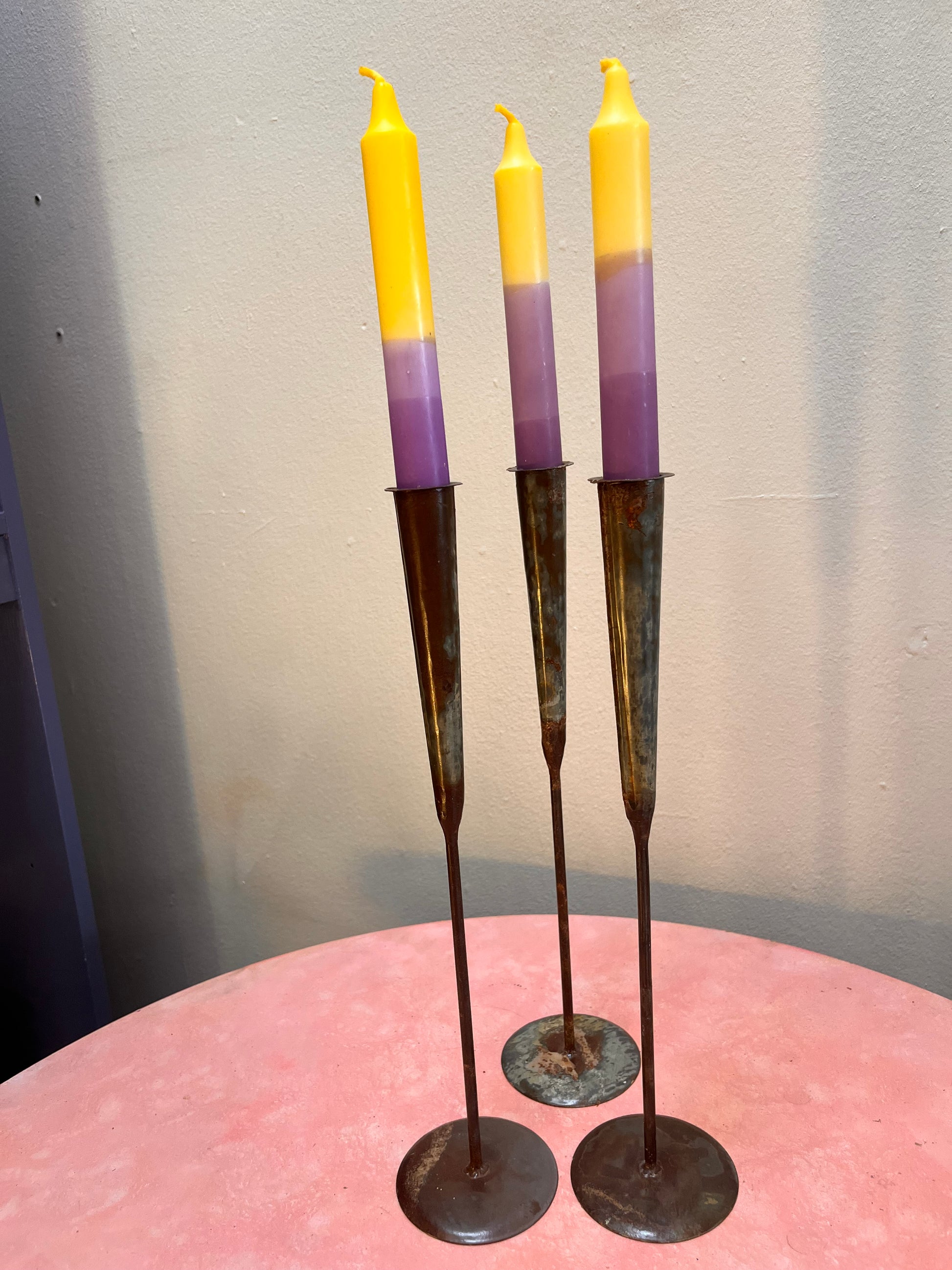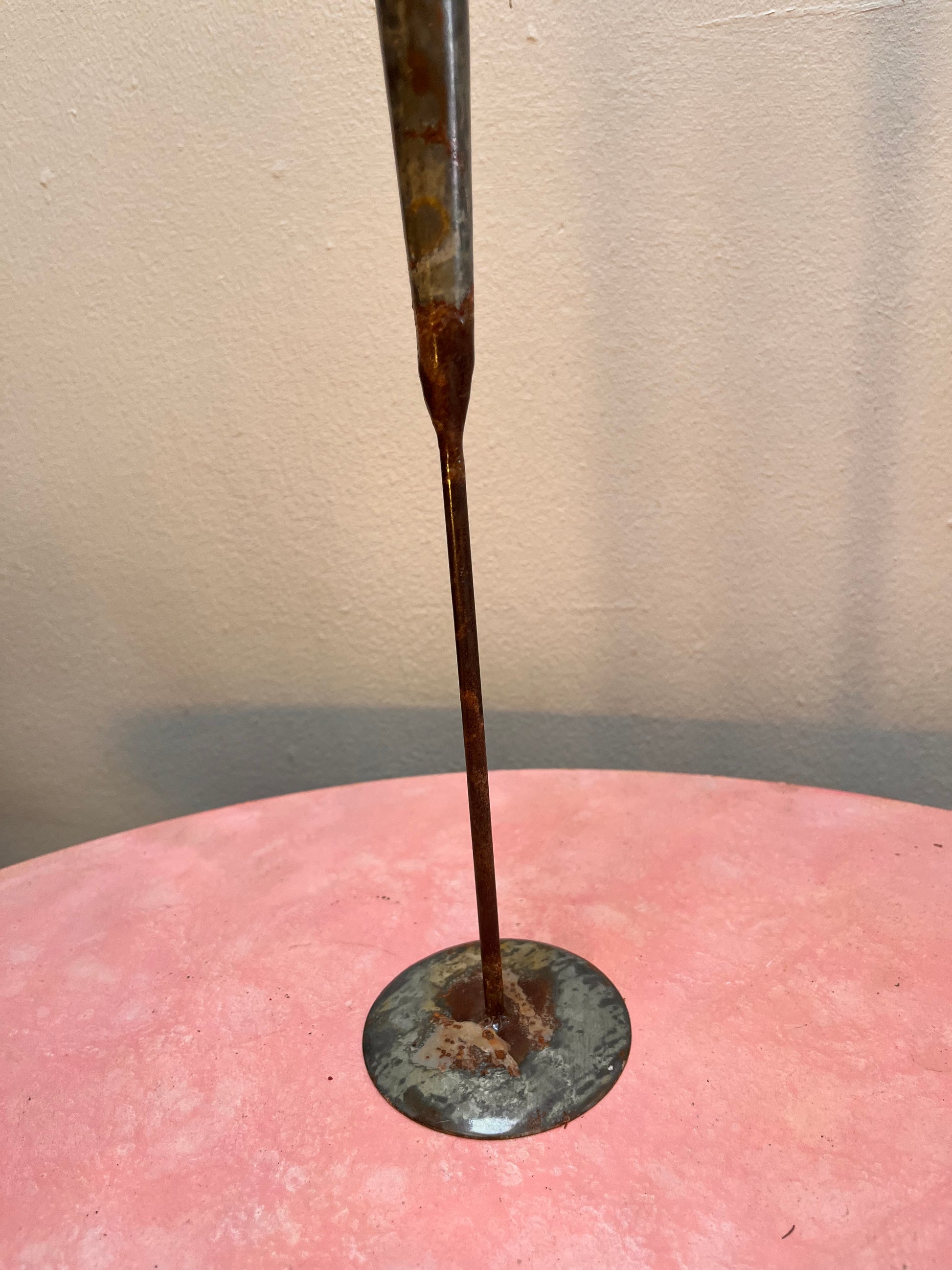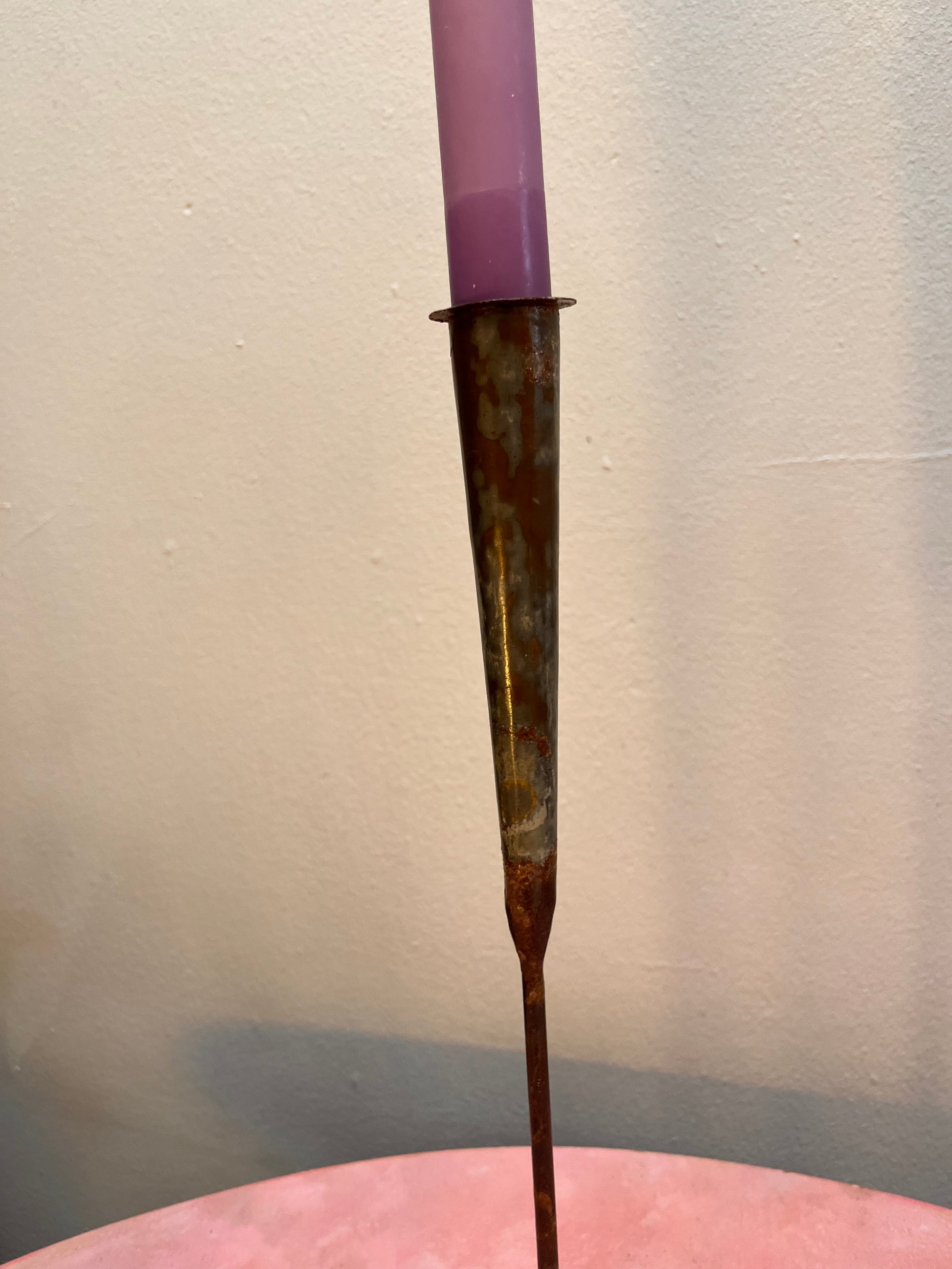 De her fantastiske lysestager, de er lavet af gamle vaffel forme. De er håndlavet af de forme, som vafler er blevet formet udenpå. Foden er lavet af andet genanvendt jern og derfor er ikke to stager ens.