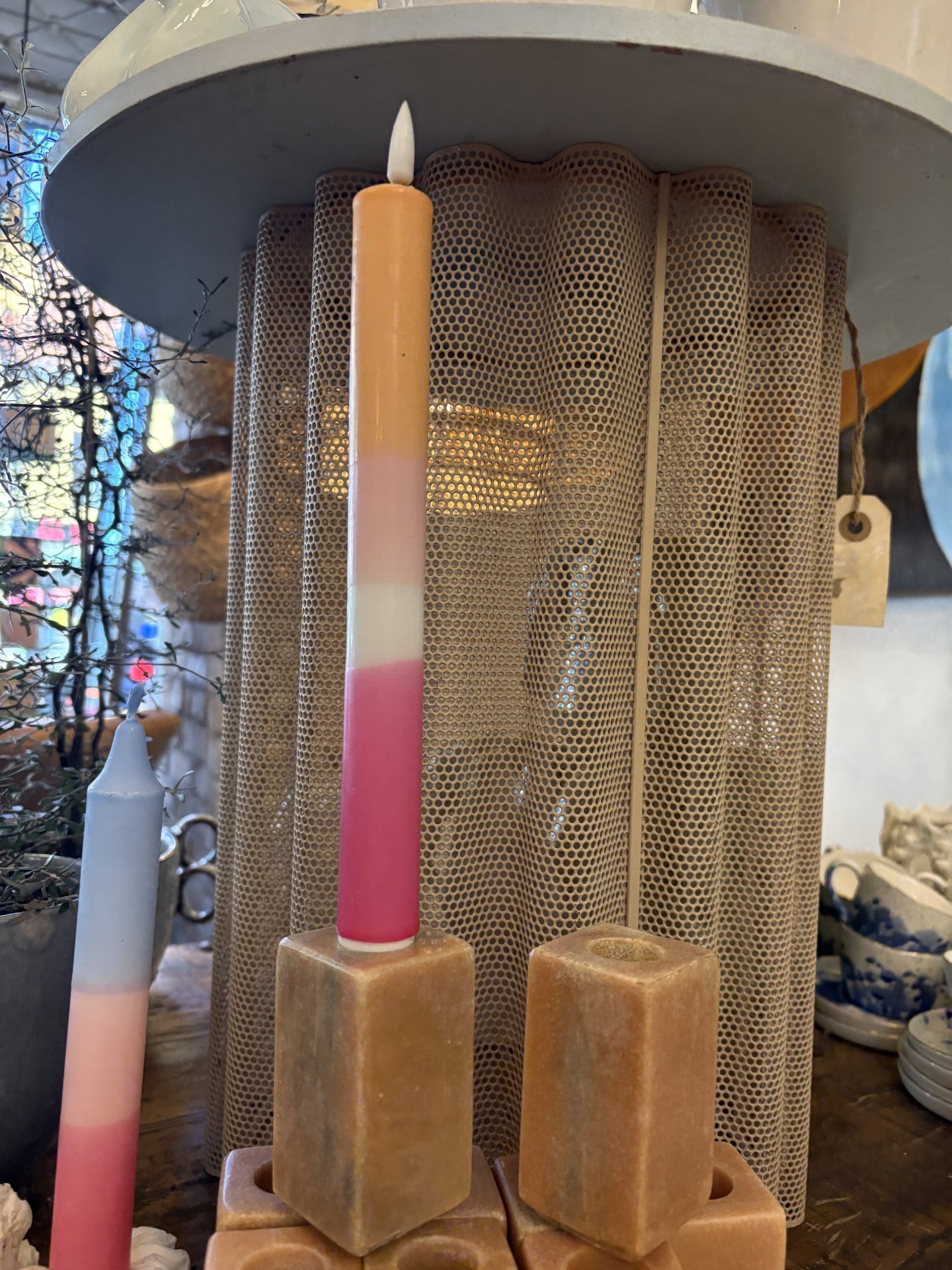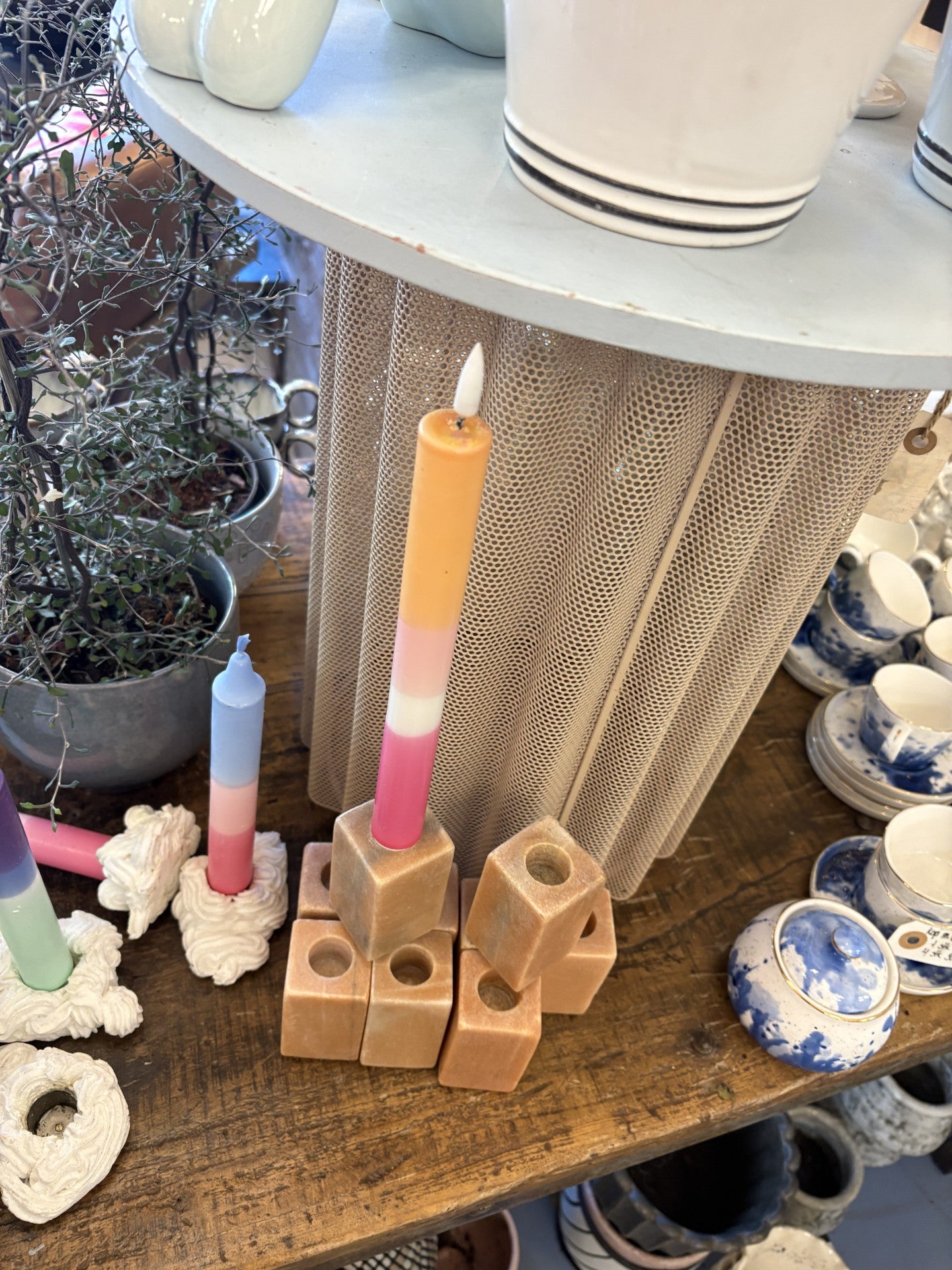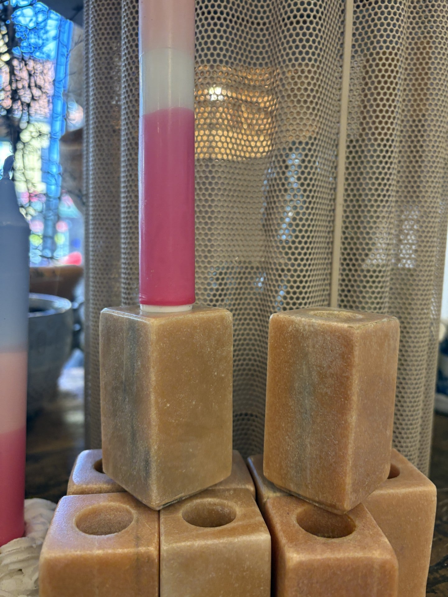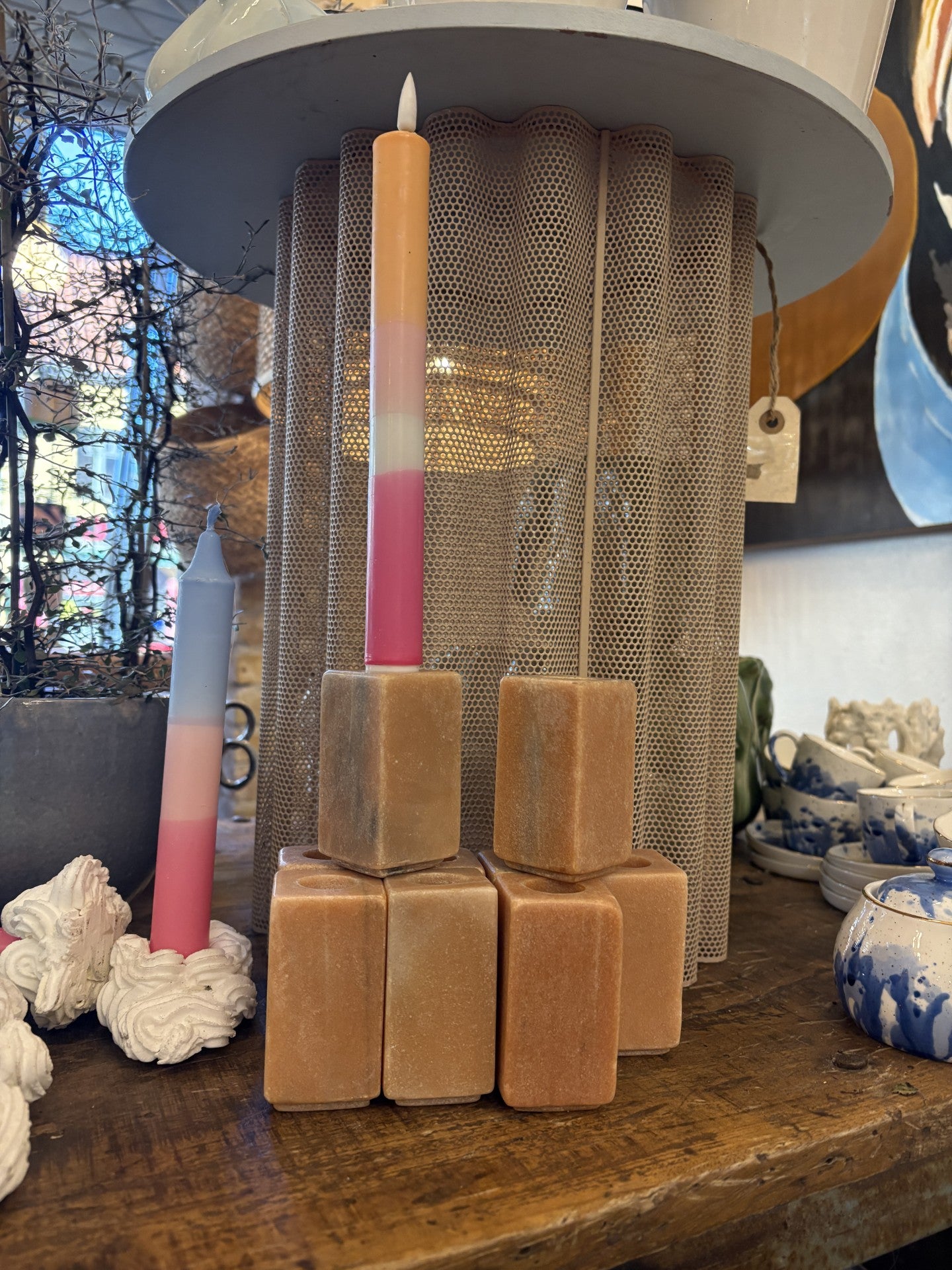 Marmor lysestager i rosa farve. Alle lysestager har deres helt egen unikke sammensætning af farve og marmorering. Lysestagerne passer til kronelys og vores helt egne led stagelys.