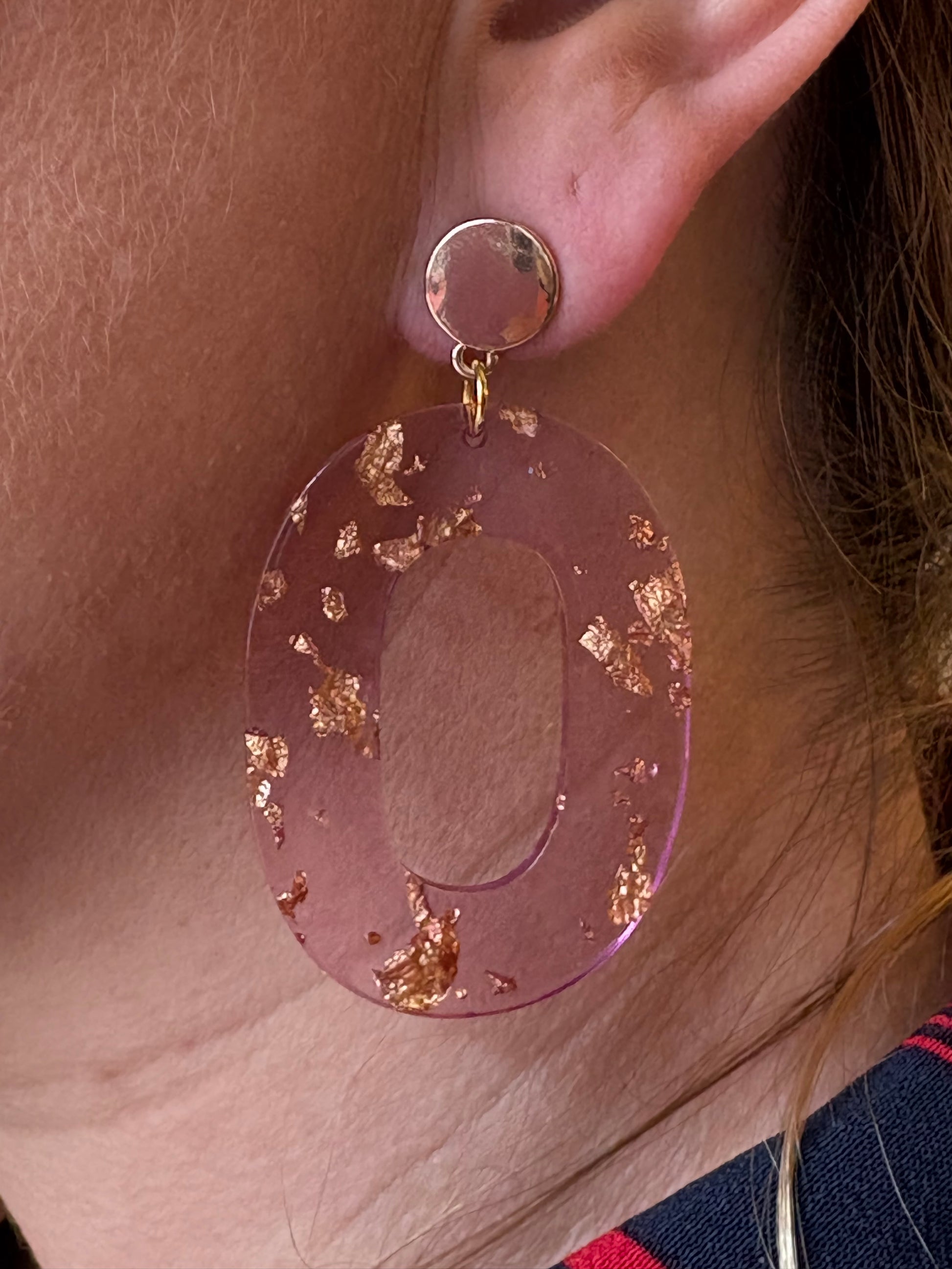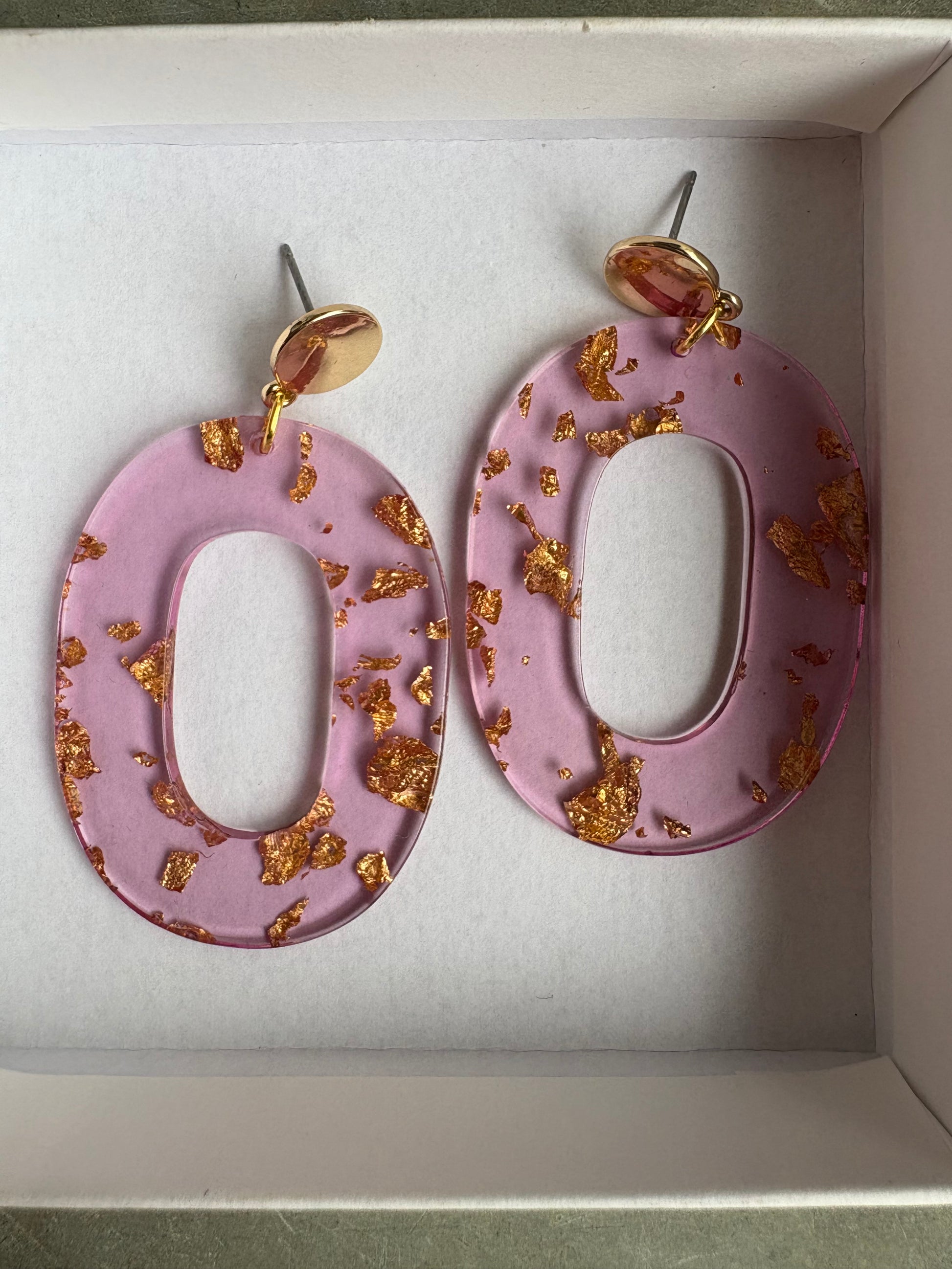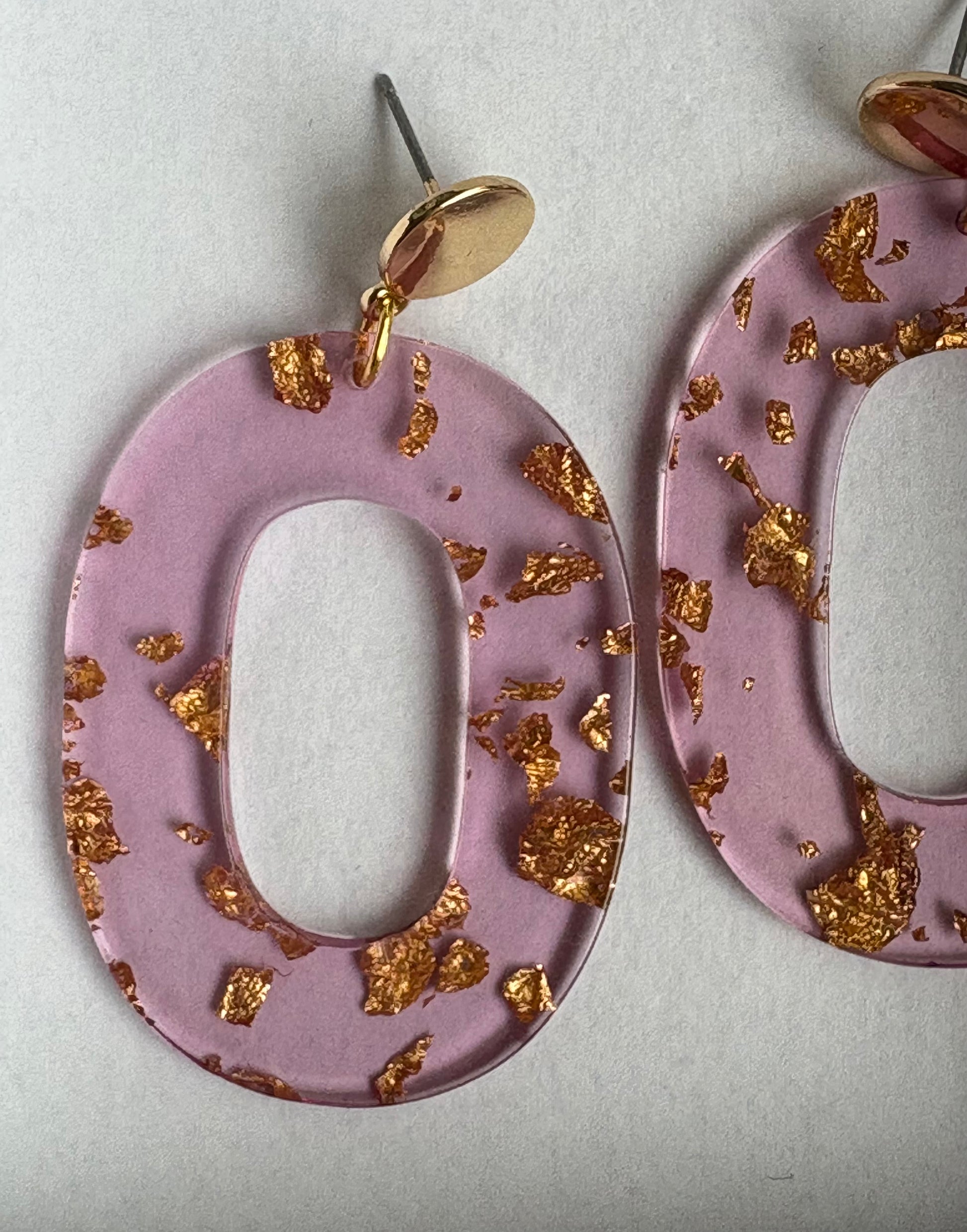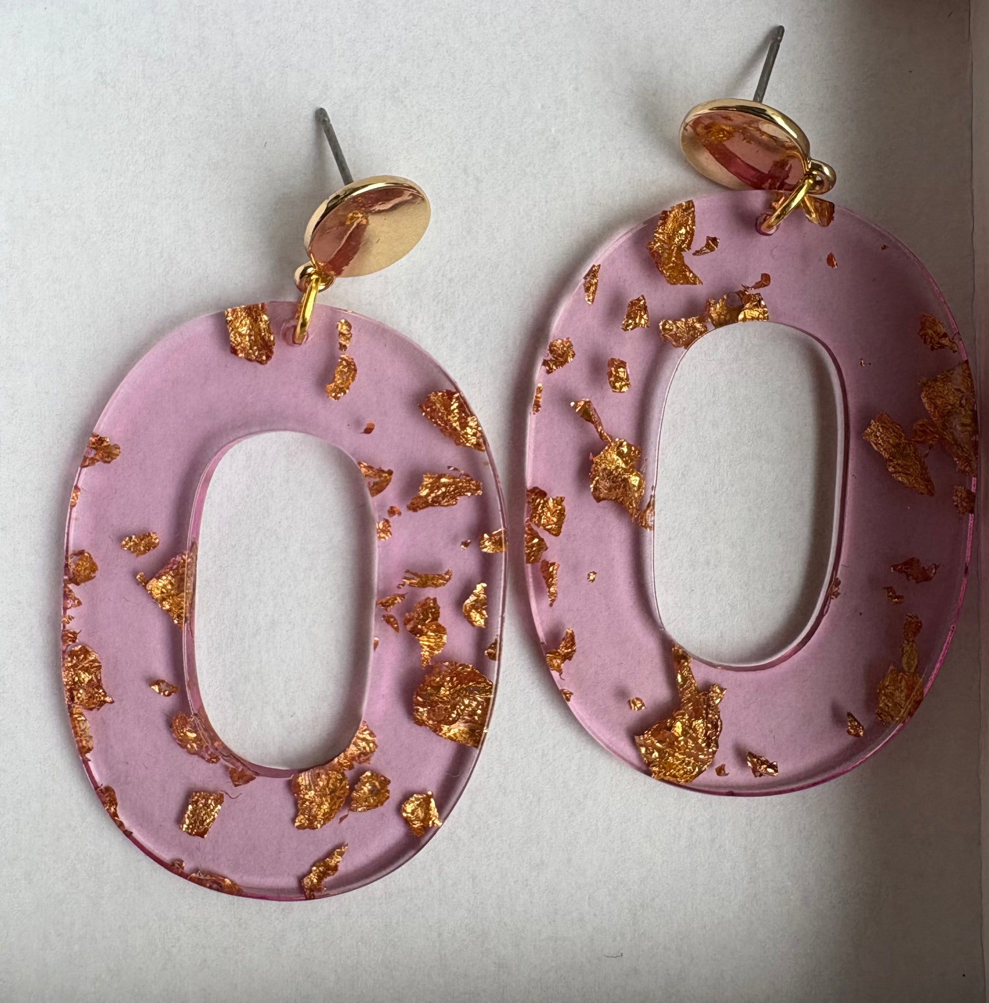 Det ovale akryl vedhæng har en smuk transparent gammel rosa farve, som er fyldt med små stykker af bladguld.