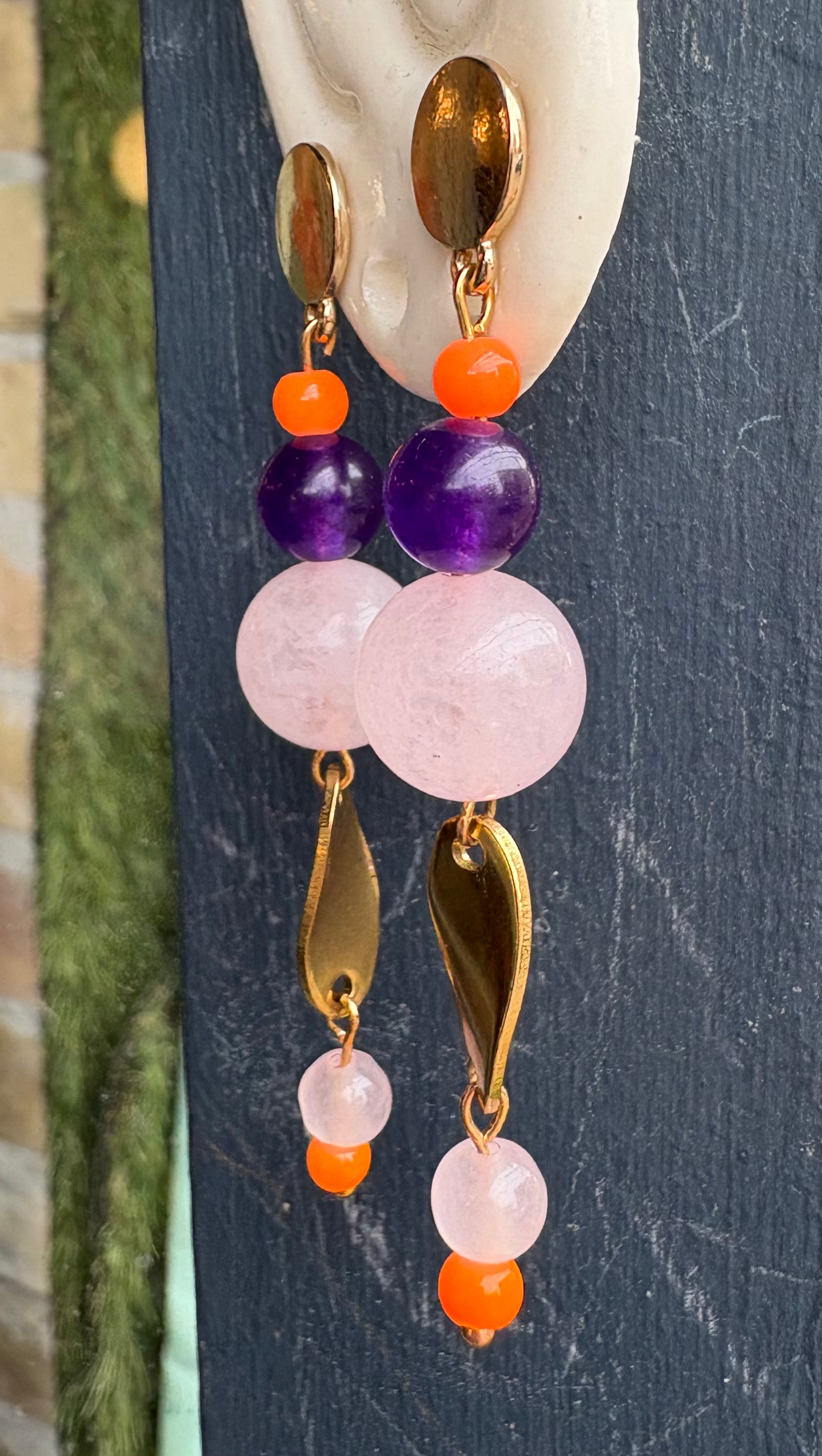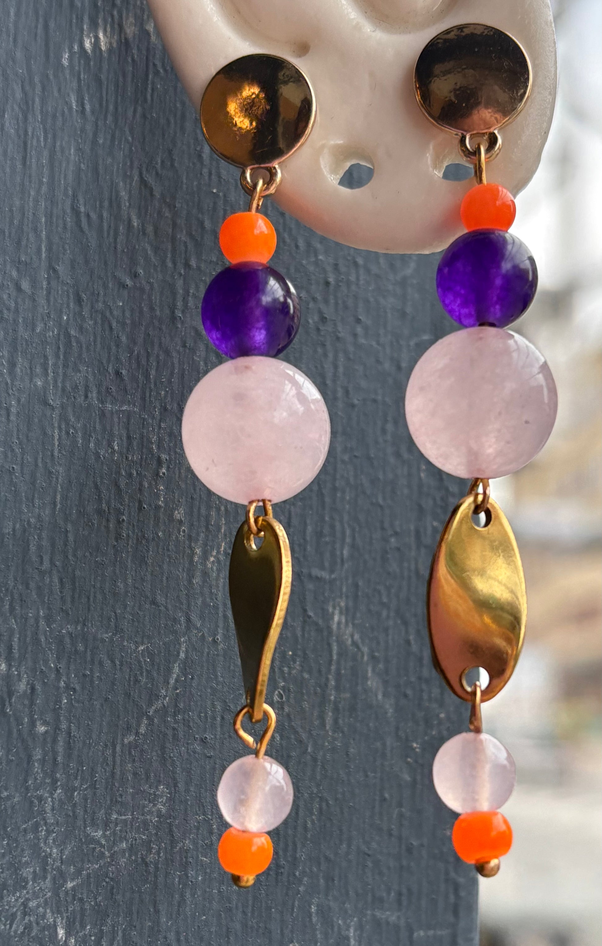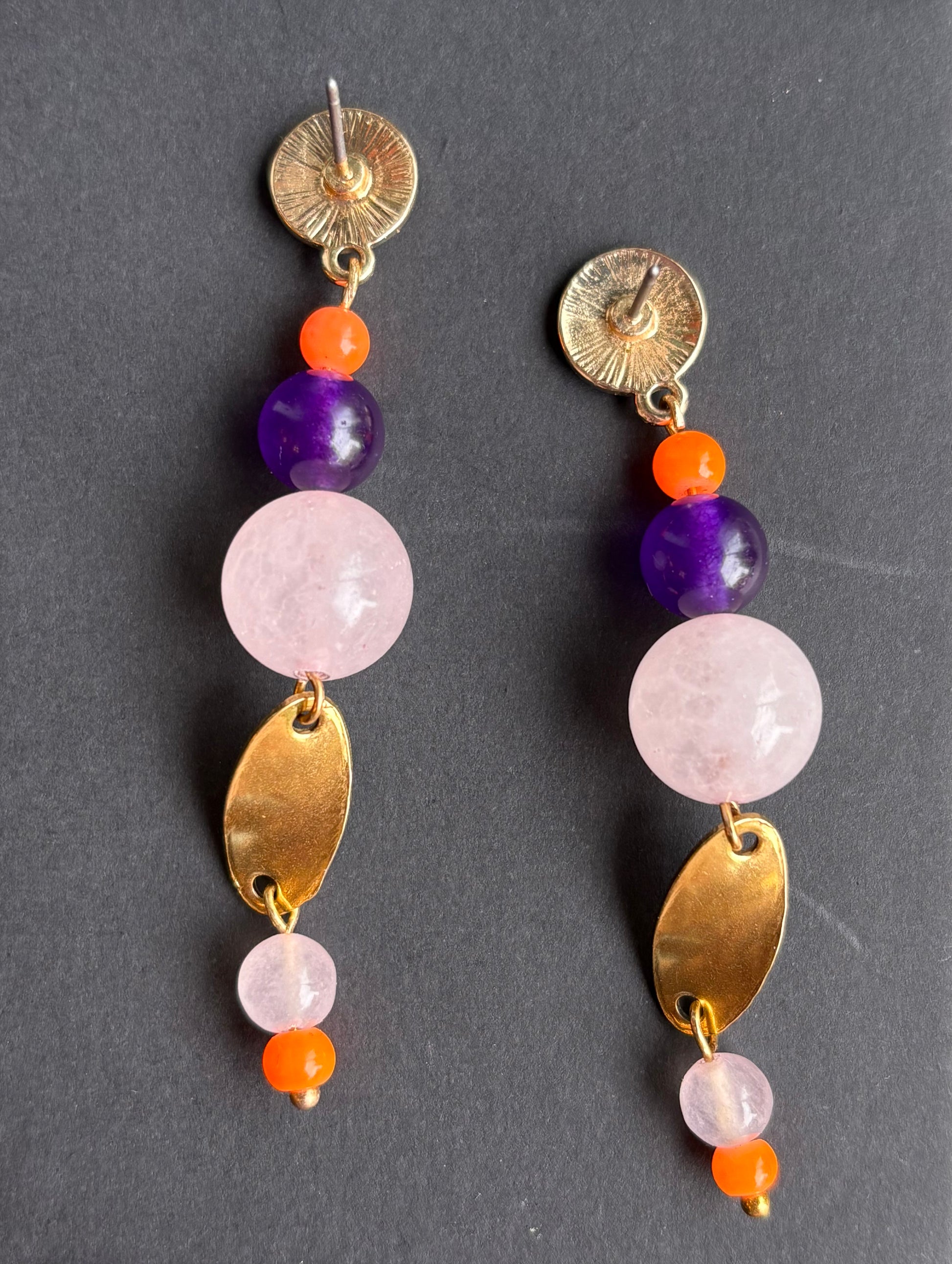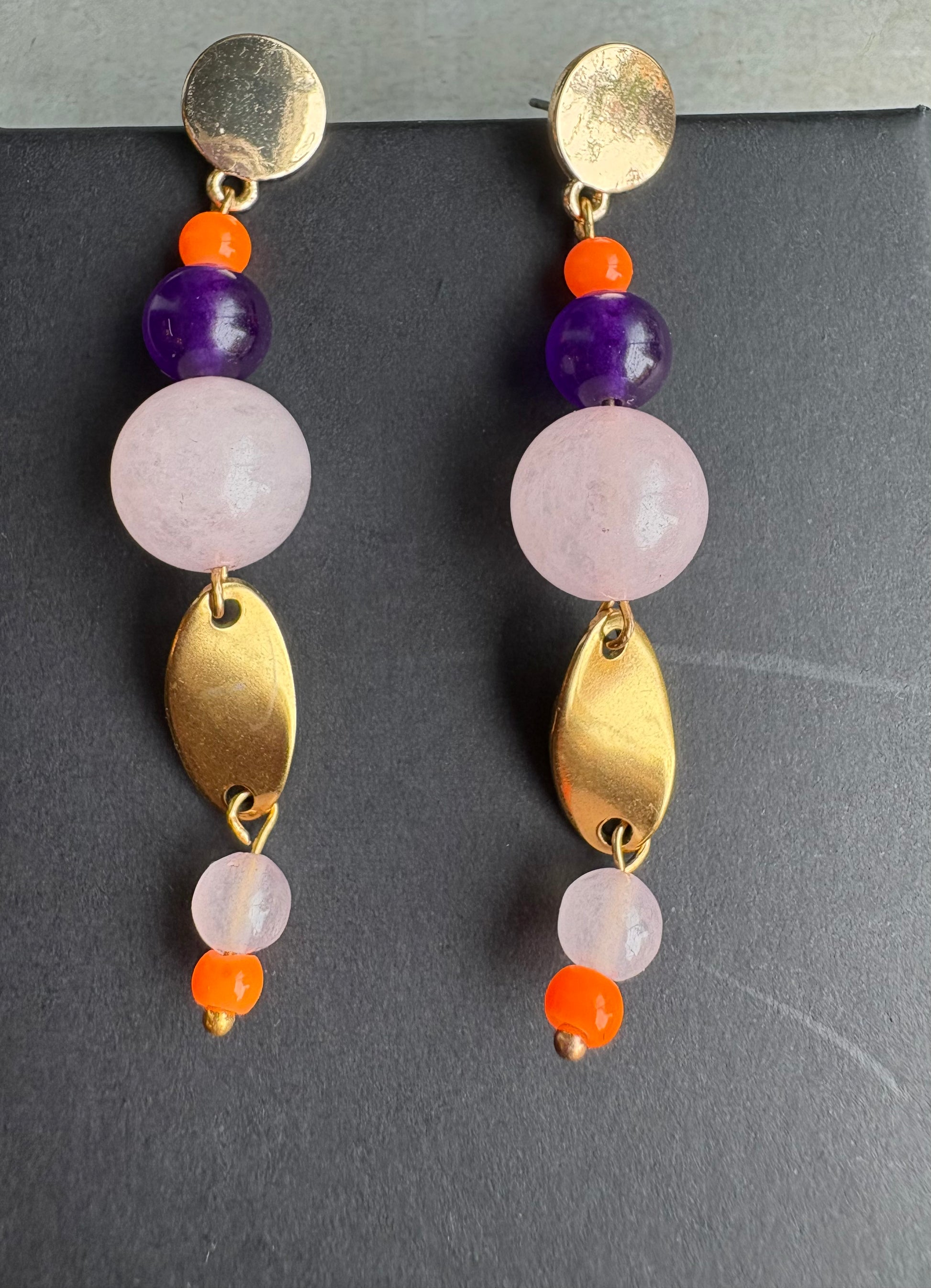 Skønne øreringe med perler i rosa quartz samt orange og lilla jade perler. Perfekte til at pifte ethvert tøjet op, til hverdag eller fest.