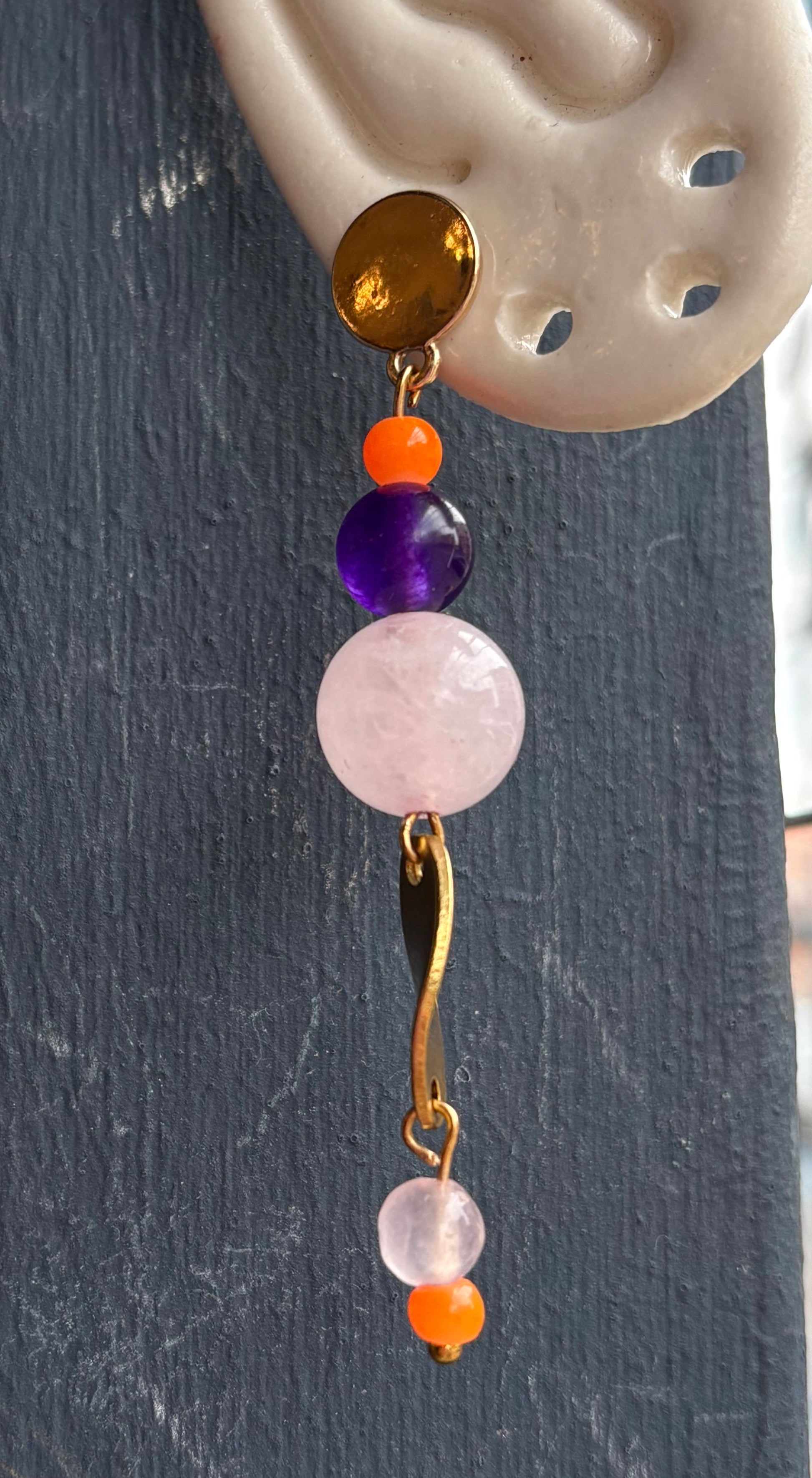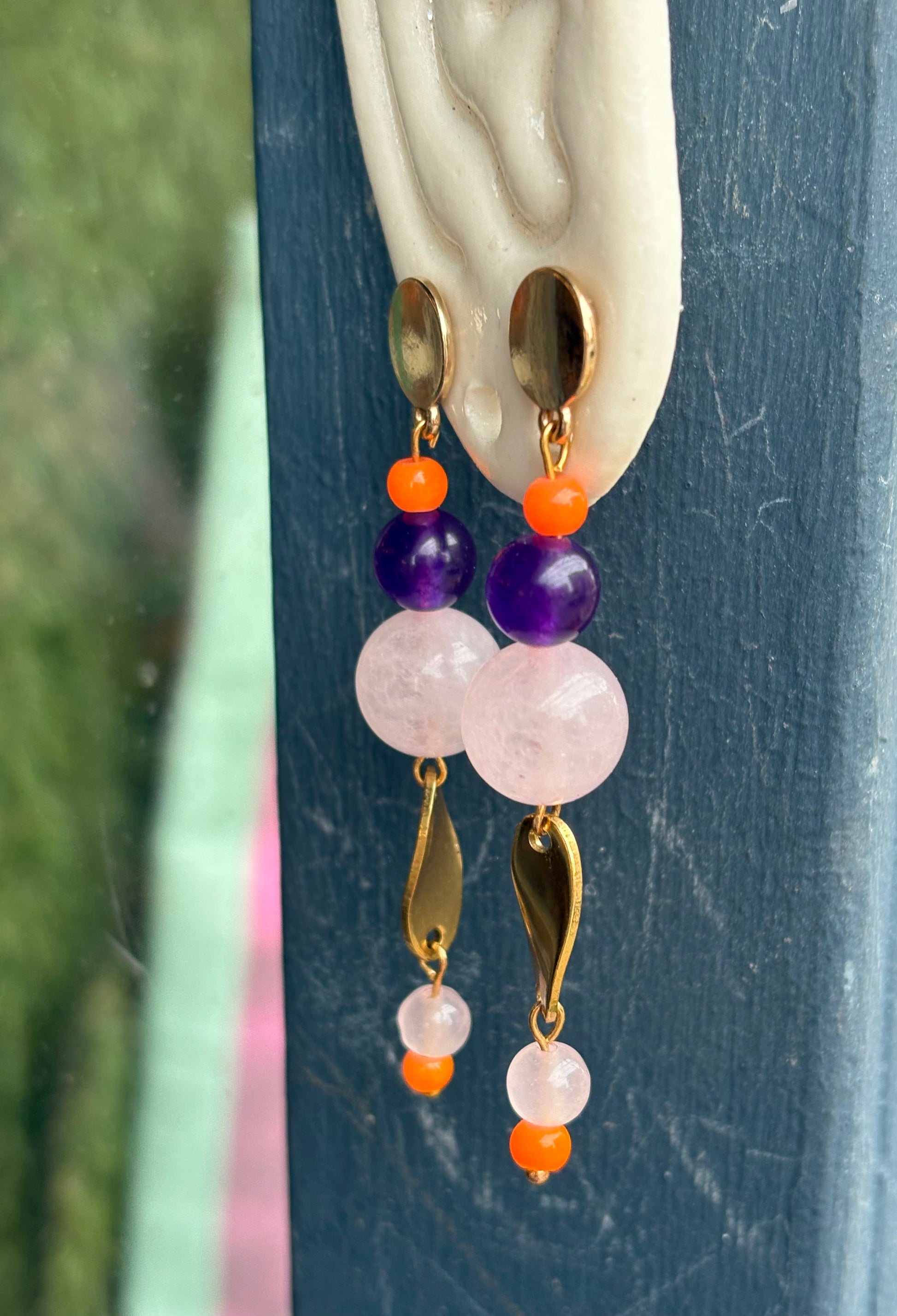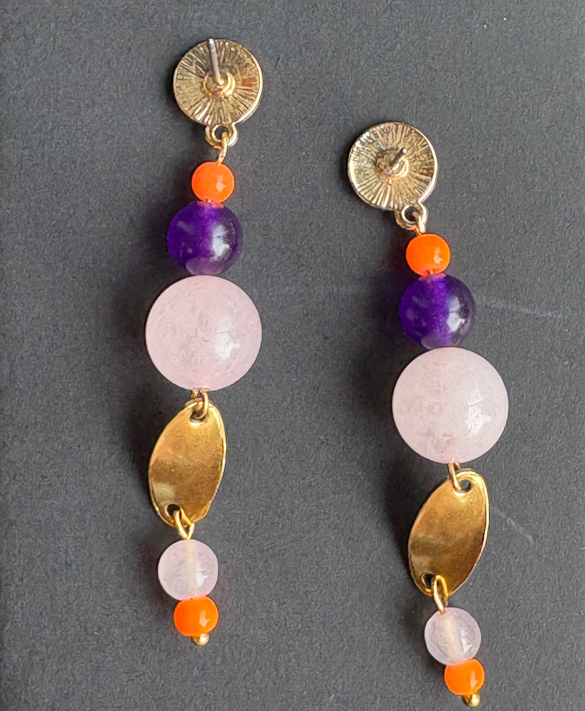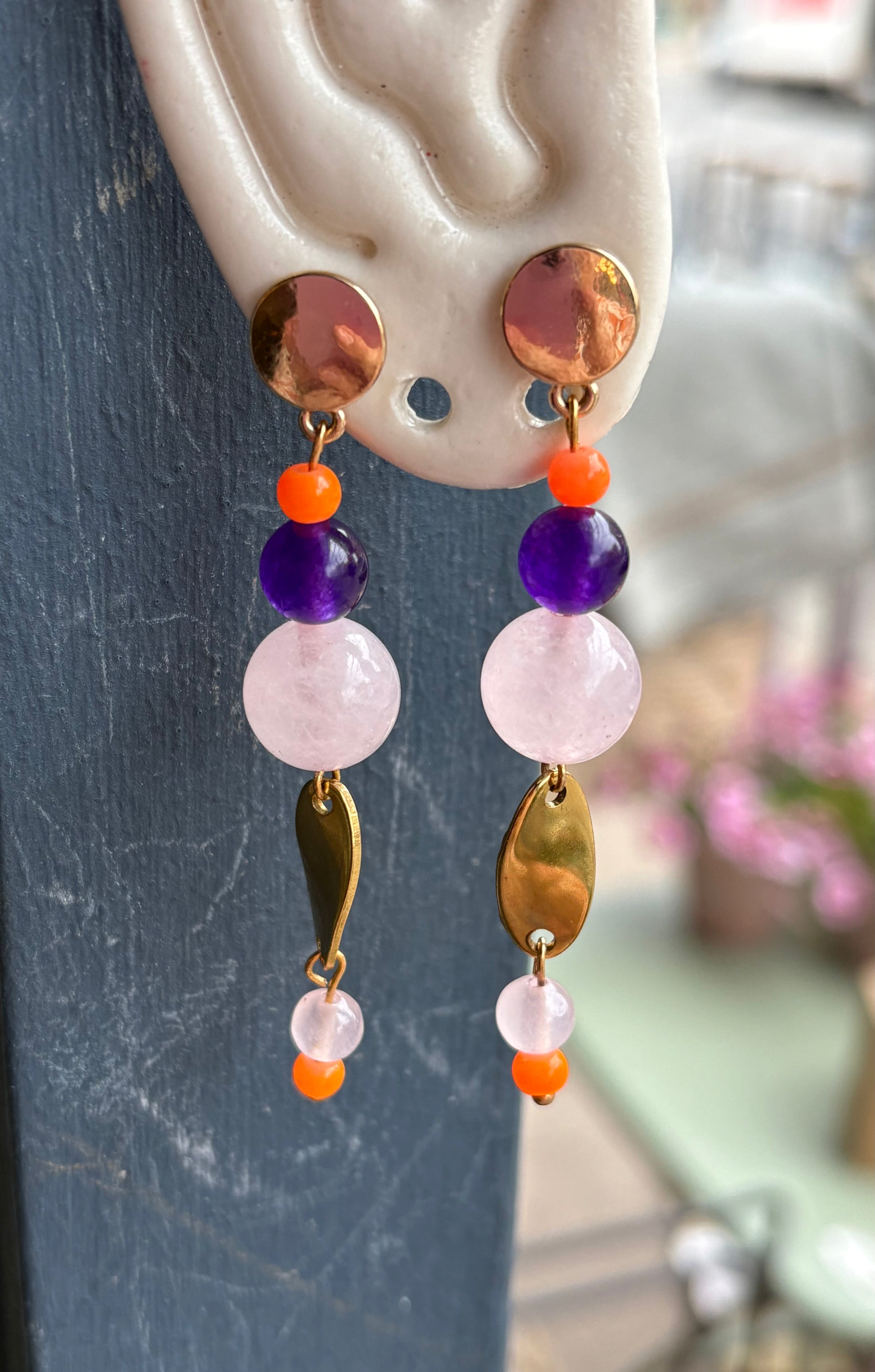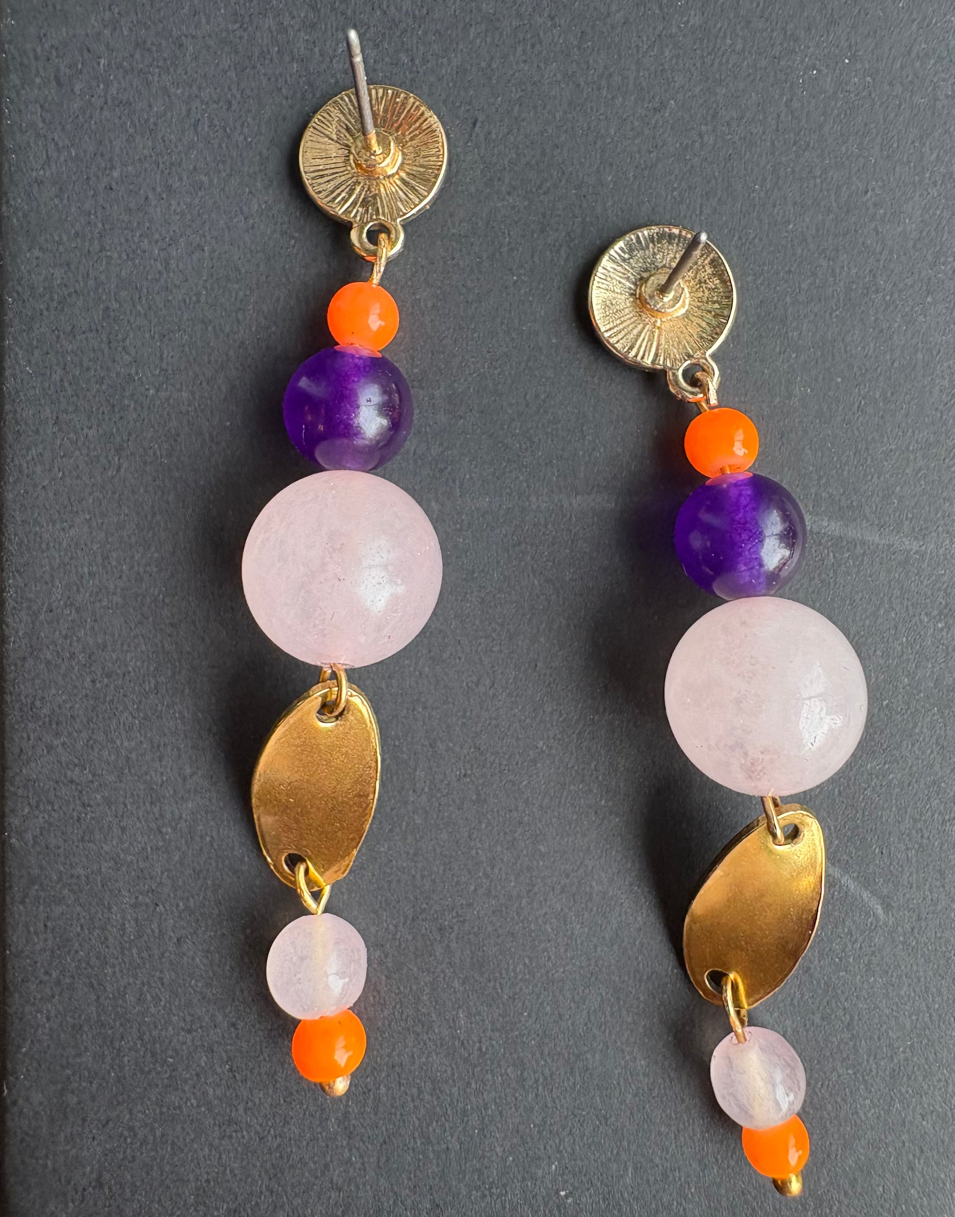 Skønne øreringe med perler i rosa quartz samt orange og lilla jade perler. Perfekte til at pifte ethvert tøjet op, til hverdag eller fest.