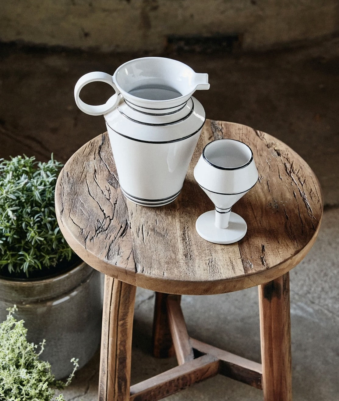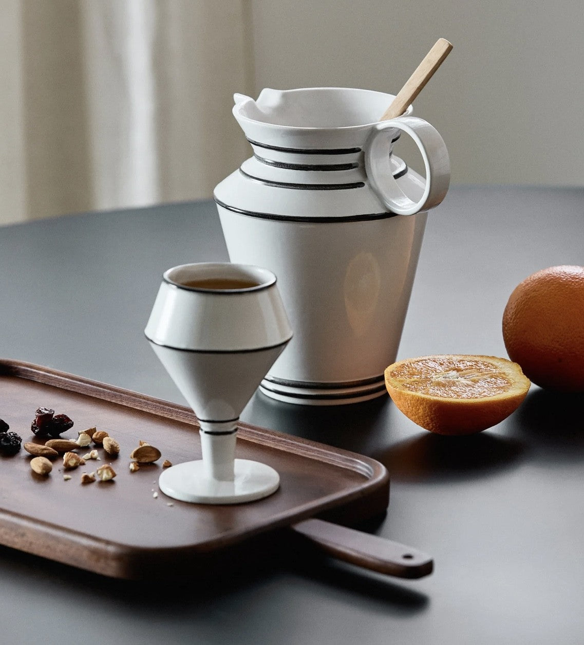 Lækre keramik vinglas i retro look. Keramik glassene kan tåle både kolde og varme drikkevare. De er fremstillet i stentøj med en blank råhvid overflade og håndmalede striber. Glassene giver med sit kantet formsprog muligheder for at pifte den klassiske borddækning op og sætte dit helt egent præg på borddækning om det er til hverdag eller fest.